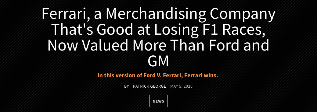 That was 2019, Ferrari made $1.4 billion EBITA last year so probably a little under $1 billion net income, and they sold like 9900 cars.  They are in the $95-100k profit per car the past few years if you just look at profit and cars sold.  Obviously some of that profit is t-shirts and merchandise, but without that brand name they wouldn’t move merch.