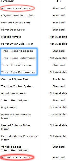 Sometimes, model feature lists on the websites are repetitive. When looking at the Chevrolet Cruze feature list again, this time in the "Exterior" tab, the first feature listed is "Automatic Headlamps". If you read further down, that same feature is listed again. Looking elsewhere on the chart, why should there be separate lines for front and rear performance or all-season tires? This adds to the already existing clutter of words on the chart.