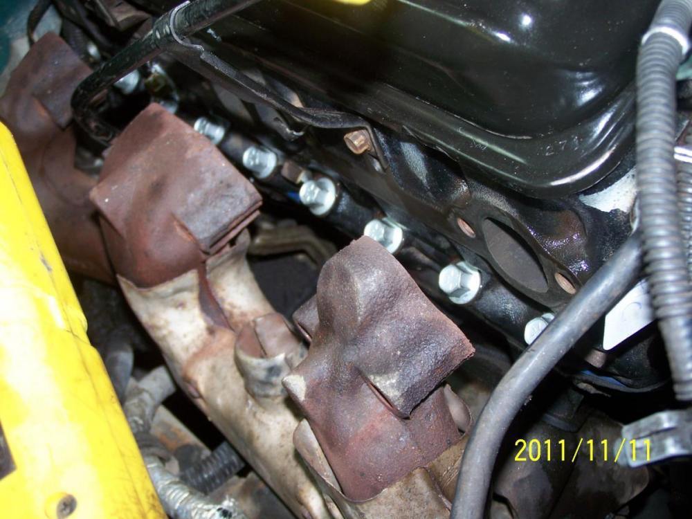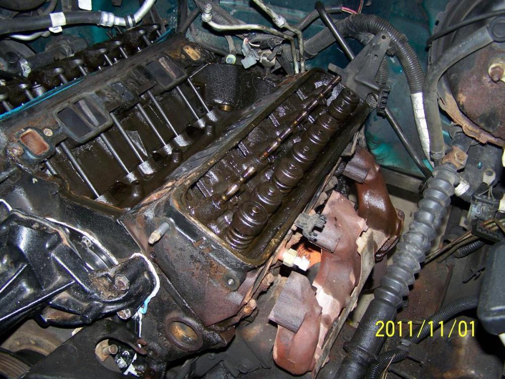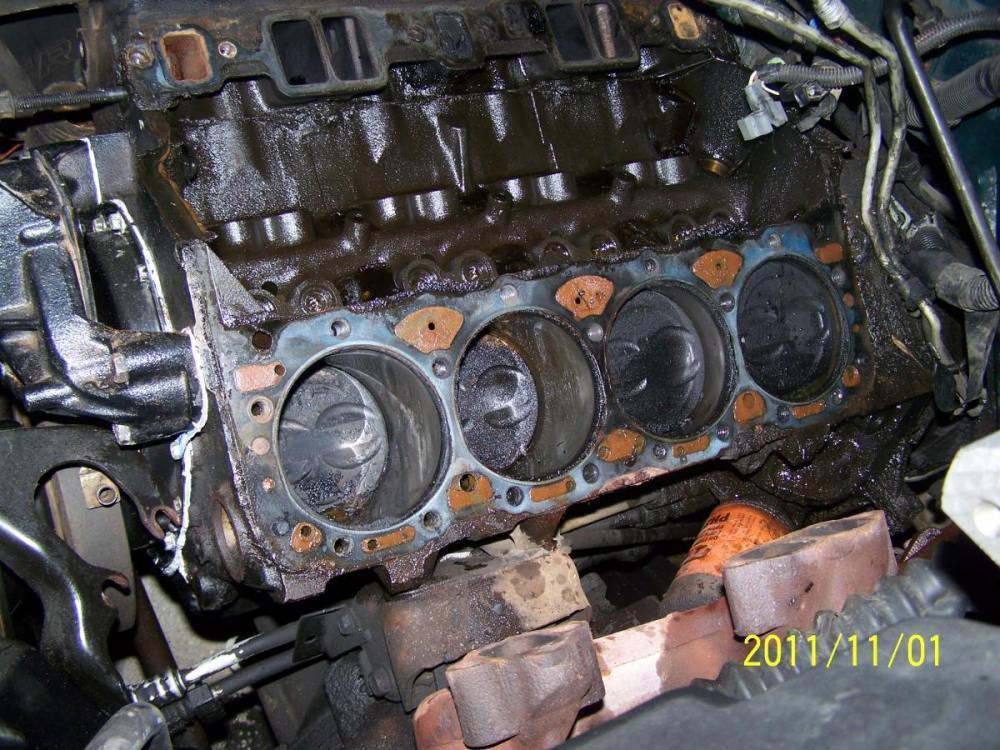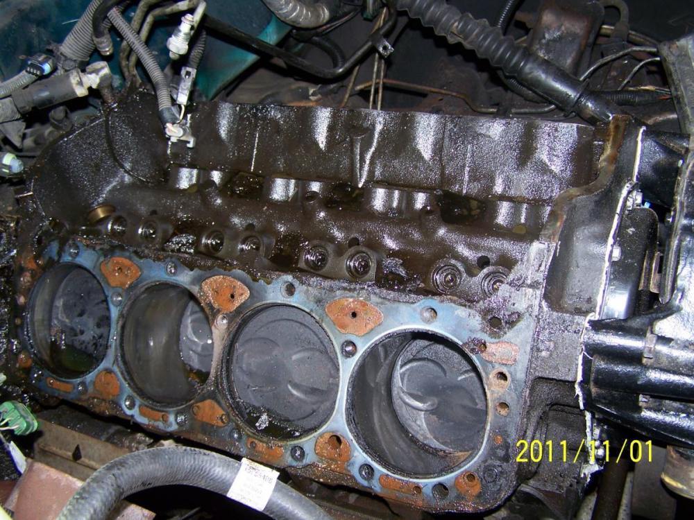 November 1, 201114 yr Author I was going to wait until both heads were off to post these, but since the site will be down tonight I'll do it now. I ended up having to remove the driver's side exhaust manifold after all. And the Driver's side head gave me an unexpected fight. The head bolts were really, really, tight - as if someone overtightened them to hide a head gasket leak? Who knows, but the previous owner was a real tool so it could be. At any rate, here are some pics: