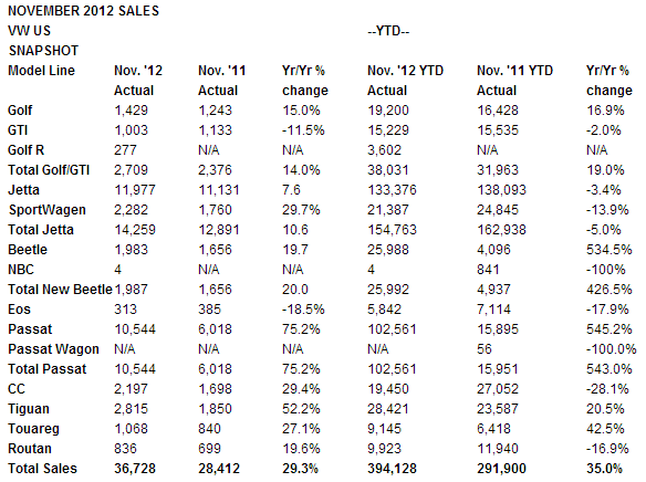 December 3, 201213 yr VOLKSWAGEN REPORTS NOVEMBER 2012 SALES - Company reports a 35 percent increase year-to-date and 102,228 units ahead of last year’s pace - • Best November since 1973 with 36,728 units sold and a 29.3 percent increase over the prior year • Brand achieves a 35 percent increase year-to-date and 27 consecutive months of year-on-year growth • Best November and year-to-date ever for Passat and Tiguan with 10,544 and 2,815 units sold respectively • Jetta Sedan achieved sales of 11,977 units • High-mileage, clean diesel TDI models account for 21 percent of year-to-date sales Herndon, VA, Dec 3, 2012 - Volkswagen of America, Inc. (VWoA) today reported 36,728 units delivered in November, a 29.3 percent increase over prior year sales, a 35 percent year-to-date increase and the best November since 1973. “November was again a strong month for Volkswagen with a sales increase of over 29 percent on the heels of the global debut of the all-new Beetle Convertible at the LA Auto Show,” said Jonathan Browning, President and CEO, Volkswagen Group of America, Inc. “Significantly, the brand is now more than 100,000 units ahead of where we were this time last year. This is a testament to the appeal of our affordable German engineered vehicles and the strength of our dealer network." The Volkswagen Passat, recently named a 2013 Best Buy by Consumer Guide Automotive, continues to demonstrate its momentum in the market with 10,544 units sold. Jetta sedan, including the enthusiast GLI model, remains the volume leader for Volkswagen with sales totaling 11,977. The Jetta Turbo Hybrid, which received EPA ratings of 42 mpg city, 48 mpg highway for a combined mileage of 45 mpg, will soon be added to the Jetta sedan line-up. The Beetle Coupe continues to gain momentum with 1,983 units sold. The Beetle Convertible made its global debut at the Los Angeles Auto Show last week and went on sale the end of the month. The Golf and GTI, recently named to Car and Driver magazine’s 10 Best Cars for 2013, sold 1,429 and 1,003 units respectively. The enthusiast Golf R model sold 277 units. The Tiguan sold 2,815 units, the best November ever for the vehicle and a 52.2 percent increase. The Volkswagen Touareg sold 1,068 units, a 27.1 percent increase for the month. Volkswagen continued sales success with its TDI® Clean Diesel models, with 7,182 total units sold in November, a 27.8 percent increase versus the prior year. TDI models account for 21 percent of the Volkswagen line-up year-to-date. The only affordable four-door coupe, the Volkswagen CC sold 2,197 vehicles. New to the CC family, the R-Line package also debuted at the LA Auto Show last week boasting bold styling cues, including an aggressive front end that incorporates a large lower air intake and projector-style fog lights, side skirts, and R-Line badging.