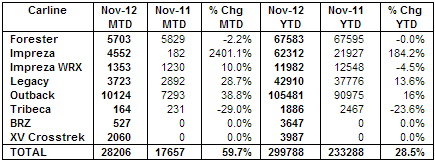 December 3, 201213 yr Subaru of America, Inc. Reports Best November Sales In Company History November 2012 sales increase 60 percent over November 2012 Subaru year-to-date sales increase 28 percent Best November for Outback, Legacy and Impreza models CHERRY HILL, N.J., Dec. 3, 2012 /PRNewswire/ -- Subaru of America, Inc. today reported 28,206 sales for the month of November, a 60 percent increase over November 2011. The company also announced record-breaking annual sales of 299,788 vehicles which represent a 28 percent increase over 2011 and just 222 vehicles short of achieving 300,000 sales for the first time in company history. Following the November close, on Dec. 1, 2012, Subaru achieved the 300,000th sales milestone for the first time in company history. Outback, Legacy and Impreza models experienced the best November sales month in history. Year-to-date sales for Impreza have increased 184 percent over 2011. Year-to-date sales for newly-refreshed Outback and Legacy models have increased 16 percent and 14 percent respectively. The new BRZ and XV Crosstrek models also added 2,587 incremental sales for the month of November. "With such strong November sales, Subaru annual sales should exceed 330,000 vehicles -- which would represent a 24 percent increase over our 2011 record sales of 266,989 vehicles," said Thomas J. Doll, executive vice president and COO, Subaru of America, Inc. "This has been another exciting, record-breaking month for Subaru." "While Subaru has the industry's highest customer loyalty, we are also seeing record levels of first-time Subaru buyers -- which has significantly contributed to our sales growth this year," said Bill Cyphers, senior vice president of sales, Subaru of America, Inc.