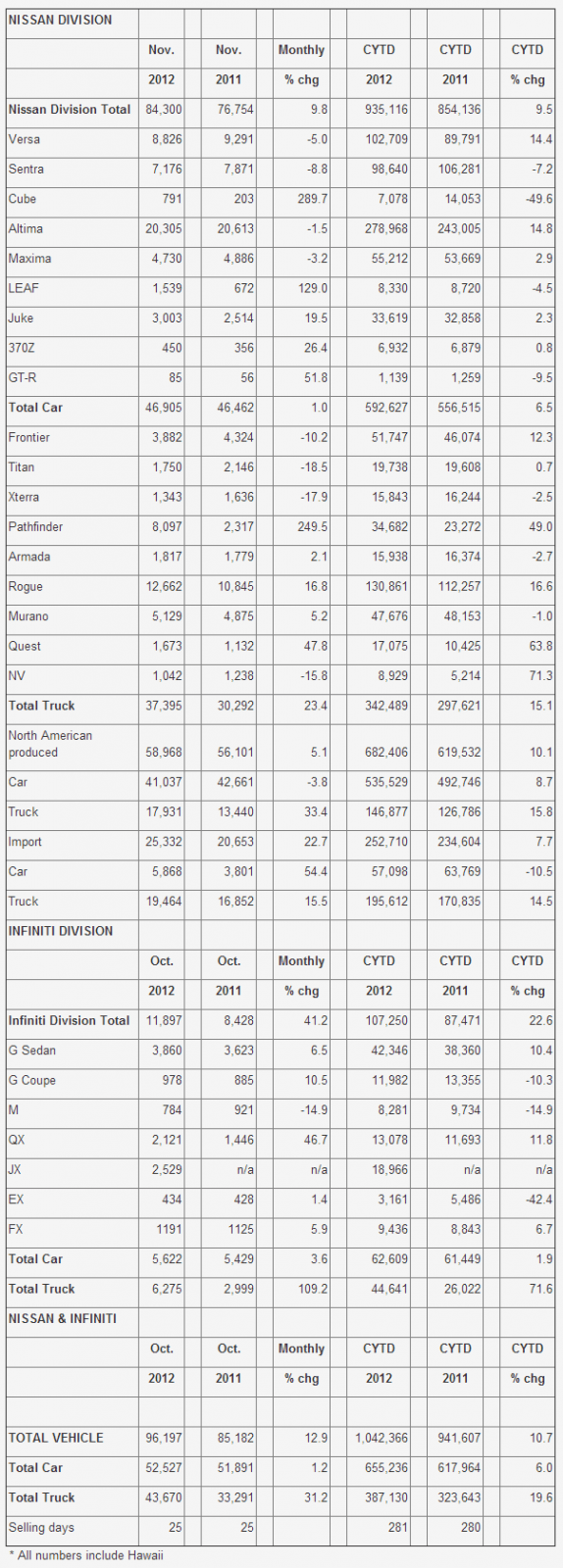 December 3, 201213 yr Nissan North America Sets New November Sales Record -Nissan and Infiniti brands each post record November sales- FRANKLIN, Tenn. – Nissan North America, Inc. (NNA) today reported record November U.S. sales of 96,197 units versus 85,182 units a year earlier, up 12.9 percent. Nissan Division set a new November record, with sales up 9.8 percent for the month over the prior year at 84,300 units. Sales of Infiniti vehicles were 11,897, up 41.2 percent over the prior year, also a November record. NISSAN HIGHLIGHTS Nissan Division posted sales of 84,300 units, up 9.8 percent from last November's 76,754 units, making it Nissan's best November ever. Pathfinder SUV sales rose 249.5 percent to 8,097 units, led by the all-new 2013 Pathfinder that went on sale in November. The all-electric Nissan LEAF recorded strong sales of 1,539 units in October, up 129 percent from the prior year at 672 units. Rogue crossover sales hit a new November record at 12,662 units, an increase of 16.8 percent versus year-ago sales of 10,845. Altima sales remained strong in November at 20,305 units, with year-to-date deliveries up 14.8 percent over its 2011 total. "Nissan's significant portfolio refresh of five new models in 15 months is showing results with the new Pathfinder driving sales of the model up nearly 250 percent," said Al Castignetti, vice president, Nissan Division. INFINITI HIGHLIGHTS Infiniti QX sales of 2,121 was an increase of 46.7 percent in November, the best month in the full-size luxury SUV's history. The all-new Infiniti JX 7-passenger luxury crossover had sales of 2,529 units in November, and 18,966 have been delivered since it went on sale in March. Overall, total sales of 6,275 for all Infiniti crossovers and sport utility vehicles in November more than doubled versus prior year. The Infiniti G Line had an increase of 7.3 percent for the month, with 4,838 sport sedans, coupes and convertibles being delivered. Infiniti had the best November in its history. "November was a fantastic month for Infiniti, with sales of each of our crossovers and sport utility vehicles showing an increase and contributing to the best November since we started sales in 1989," said Ben Poore, vice president, Infiniti Americas. "We expect showroom traffic to remain strong through the holiday gift-giving season, as our Winter Limited Engagement Event continues through January 2." NOTE: To ensure consistency in global sales reporting, Nissan North America calculates monthly variances on a straight-percentage basis, unadjusted for the number of selling days. November had 25 selling days both in 2012 and 2011.