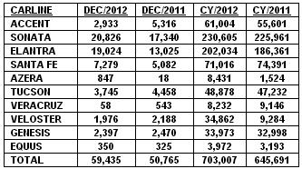 January 3, 201313 yr Hyundai Motor America Posts All-Time Full Year Sales Record - Best December ever - Sonata and Elantra both finish in the Top 10 in car retail sales - Sonata and Elantra both top 200K in sales - Sonata, Elantra, Veloster, Genesis, Equus have best-ever sales years COSTA MESA, Calif., Jan. 3, 2013 /PRNewswire/ -- Hyundai Motor America today announced record sales of 59,435 vehicles in December, a 17 percent total sales increase and three percent retail sales increase compared with the same record-setting period a year ago. For the year, Hyundai sales were up nine percent versus 2011 in both retail and total sales. Sales to fleet accounts represented just 10 percent of total sales for 2012, among the lowest in the industry. "The holiday selling season, in conjunction with improved consumer confidence, made for a successful December," said Dave Zuchowski , executive vice president of sales. "Our momentum over the last several months, paired with improved inventory levels and the launch of seven new or refreshed products in 2012, positions us for continued growth in the new year, especially with the seven-passenger version of the new Santa Fe set to launch in the next few weeks." The Alabama-built Sonata and Elantra, two of the top-10 retail-selling cars in 2012, once again set full-year records with sales of 230,605 units, up two percent and 202,034 units, up eight percent, respectively. Sonata Hybrid sales were up 74 percent for the year. Veloster finished the year up 276 percent with a strong showing of 34,862 sales, best ever, and the recently refreshed Accent saw sales gains of 10 percent. The all-new Azera continues to sell at a quick pace and saw sales gains of 453 percent for the year. With the North American International Auto Show just around the corner, Hyundai is making plans to reveal the new design direction for its premium rear-wheel drive lineup. In 2012, Hyundai's premium Genesis and Equus models continued to surprise and delight more and more consumers, experiencing their fifth consecutive year of sales growth. Hyundai's six percent retail market share in the premium segments in which it competes now exceeds Hyundai's overall five percent retail share of the total industry. Genesis delivered 33,973 sales for the year, an increase of three percent over 2011, with Equus sales up 24 percent to 3,972. Both models set annual sales records, while Hyundai's total rear-wheel drive car sales of 37,945 places it above many established luxury nameplates in this category. "We closed 2012 with strong demand in both volume and premium segments, and all-time sales records for December and the full year," said John Krafcik , president and CEO, Hyundai Motor America. "2013 will mark our first full year of three-shift U.S. production for Sonata, Elantra, and Santa Fe, which will allow us to better meet the demand we're seeing from American car buyers for our three most popular vehicles."