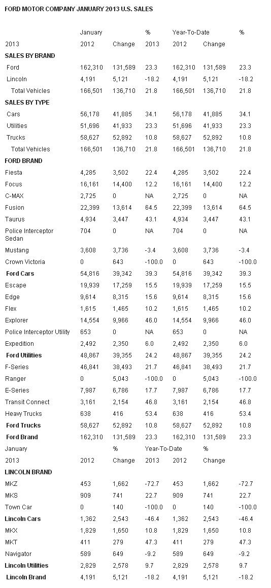 February 1, 201313 yr Ford Motor Company January Sales up 22 Percent, Best since 2006; Fusion, Escape Post Record January Sales Ford Motor Company’s January U.S. sales increase 22 percent, with gains across the lineup – cars up 34 percent, utilities up 23 percent, and trucks up 11 percent Fusion up 65 percent versus year-ago levels – a record January sales month Escape has best January sales ever – sales increase 16 percent, topping last year’s January record Explorer sales up 46 percent – best January sales since 2005 America’s best-selling pickup for 36 years running, F-Series posts a 22 percent gain DEARBORN, Mich., Feb. 1, 2013 – Ford Motor Company’s January U.S. sales of 166,501 grew 22 percent year-over-year – with retail sales up 24 percent. Gains were made across the product lineup, with cars up 34 percent, utilities up 23 percent, and trucks up 11 percent for the month.“Ford is off to a strong start this year, with Fusion and Escape delivering January sales records and F-Series seeing a particularly strong reception this early in the year,” said Ken Czubay, Ford vice president, U.S. Marketing, Sales and Service. “Our investment in fuel-efficient new vehicles – including EcoBoost engines and hybrid technology – continues to pay off.”Sales of all-new Ford Fusion totaled 22,399 vehicles in January, 65 percent increase versus a year ago and Fusion’s best January sales ever. Fusion broke its January 2011 sales record by 56 percent. In addition, Ford’s small car sales were up 29 percent in January versus a year ago, with 23,171 Fiesta, Focus and C-MAX hybrid models sold, marking Ford’s best January small car sales since 2000.Escape established a January record, as well, with sales totaling 19,939, exceeding January 2012’s record by 16 percent. Explorer sales of 14,554 increased 46 percent versus a year ago, marking Explorer’s best January sales since 2005. America’s best-selling pickup, the Ford F-Series, begins 2013 with a 22 percent increase versus last January. With 46,841 pickups sold, F-Series marks its 18th consecutive month of monthly sales increases. Transit Connect and E-Series also had strong starts to the year. Transit Connect sales were up 47 percent, marking record January sales total of 3,161 vehicles, while E-Series sales were up 18 percent, with 7,987 vehicles sold.