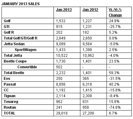 February 1, 201313 yr VOLKSWAGEN REPORTS 6.7 PERCENT INCREASE IN JANUARYJanuary sales total 29,018, best January since 1974 Much-anticipated Game Day ad released Best January since 1974 with 29,018 units delivered and a 6.7 percent increase over the prior year Chattanooga-built Passat had its best January ever with 8,856 units delivered Best January for Golf since 2000 with 1,532 units delivered Jetta sedan achieved 9,089 units in January Sport utility vehicles, the Tiguan and Touareg, reported sales of 2,114 and 962, respectively High-mileage, clean diesel TDI models accounted for 19 percent of sales in January Herndon, VA, Feb 1, 2013 - Volkswagen of America, Inc. (VWoA) today reported 29,018 units sold in January, a 6.7 percent increase over prior year sales. The company achieved 29 consecutive months of year-over-year growth and the best January since 1974. Over the last three years, the company has more than doubled its annual sales volume, demonstrating its long-term growth strategy, Mach 18, is gaining momentum in the U.S. market. “With all the buzz that comes with the North American International Auto Show, the release of our Super Bowl advertisement, “Get Happy,” and a full line-up of new and refreshed vehicles, Volkswagen is off to a solid start in 2013,” said Jonathan Browning, President and CEO, Volkswagen Group of America, Inc. “While the economic conditions continue to be somewhat uncertain, we expect Volkswagen to achieve continued growth and to outpace the industry this year.” Volkswagen’s 60-second Super Bowl XLVII advertisement stays true to the brand’s storytelling heritage of “human stories, told simply.” It builds on the upbeat themes of recent ads, “Smiles”, released in September 2012, and last year’s Super Bowl spot, “The Dog Strikes Back,” named a leading 2012 ad on YouTube by Google. In 2011, VW released “The Force” Super Bowl ad, which received more than 56 million YouTube hits to date, and was recently named one of the best ads in the past 24 years by USA Today. Last week, Volkswagen teased its 2013 Game Day spot with “Sunny Side,” featuring well-known YouTube sensations, and renowned reggae artist Jimmy Cliff singing “The Partridge Family’s” theme, “C’mon, Get Happy.” The Chattanooga-built Passat continues to deliver strong results with 8,856 units sold, marking its best January ever. Jetta sedan remains the volume leader for Volkswagen with sales totaling 9,089. With the addition of the Jetta Turbo Hybrid, Volkswagen now offers seven cars that can deliver more than 40 mpg on the highway – a feat no other automaker can match in the United States. Recently recognized as “best in class vehicle in the $20,000 – $25,000 price range” in Kiplinger’s Personal Finance 2013 buyer’s guide, the Jetta TDI demonstrates its strong consumer appeal and class-leading fuel economy in the compact sedan segment. The Beetle and Beetle Convertible sold a combined 2,232 units. The Golf saw a 24.9 percent increase in January sales with 1,532 units delivered. A new North American produced Golf will soon be added to line up. Production of the seventh generation Golf “A7”will commence the first quarter of 2014 at the Volkswagen de México manufacturing facility in Puebla, Mexico. This latest move reinforces the Volkswagen’s commitment to the North American market, where it will invest more than $5 billion in the next three years. Sport Utility Vehicles, Tiguan and Touareg reported sales of 2,114 and 962 units, respectively. Volkswagen’s high-mileage, clean diesel TDI models account for 19 percent of sales in January, a 14.7 percent increase over the prior year.