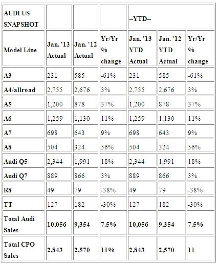 February 1, 201313 yr Audi starts the year off strong with record January sales 25th consecutive month of chart-topping sales; premium category vehicles (A8, A7, A6, and Q7) represents 33.3% of January demand Audi today reported January sales of 10,056 vehicles, accounting for a 7.5% increase over the previous mark last year. The month also stands as the 25th consecutive month of record sales for Audi of America. Coming off a record 2012, Audi is showing no signs of slowing down for 2013. Sales of Audi premium category vehicles (Audi A8, Audi A7, Audi A6, and Audi Q7) increased 13% to represent 33.3% share of total Audi sales in January. That compares to a 19% mix for the most luxurious Audi models in 2008. Consumers continue to demand the Audi A8 flagship sedan, as sales soared 56% over the year earlier. Audi A5 sales also performed well, posting a 37% gain from January 2012 sales. “January served as the perfect catalyst for 2013,” said Mark Del Rosso, EVP and Chief Operating Officer, Audi of America. “As we continue to increase the footprint of our brand, we will also continue to deliver more record-breaking numbers throughout this year.” Highlights: Sales mix for Audi S models finished the month at 16.2% for the S4, 38.7% for the S5/ RS 5, 11.9% for the S6, 20.7% for the S7, 23% for the S8 and 55.9% for the TT-S/ TT-RS. Audi A5 sales up 37% compared to January 2012. Sales of Audi A6 increased 11% compared to January 2012. Sales of the Audi A8 increased 56% compared to January 2012. Sales of the Audi Q5 increased 18% compared to January 2012. Sales mix for Audi TDI clean diesel models finish the month at 38.9% for the A3 TDI and 21.5% for Q7 TDI. For the record-setting month of January 2013, two Audi models recorded year-over-year sales increases of 20% or more, including the Audi A5 and Audi A8. Audi Certified pre-owned sales of 2,843 vehicles marks a new record for January CPO sales, surpassing the previous record from January 2009.