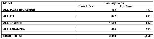 February 1, 201313 yr Porsche Reports Best January Sales Ever; 32 percent increase over last year ATLANTA, Feb. 1, 2013 /PRNewswire/ -- Porsche Cars North America, Inc. (PCNA), importer and distributor of Porsche sports cars, Cayenne SUVs and the Panamera four-door sports sedan line-up in the United States, today announced record January sales of 3,358 vehicles. This compares to 2,550 vehicles sold in January 2012, an increase of 32 percent. The successful month follows Porsche's record-setting year in the U.S., with 35,043 vehicles sold in 2012. The Cayenne SUV and 911 models contributed to the record January, with 1,500 Cayenne units sold (+51% over January 2012) and 877 units of the 911 sold (+28%). The Boxster/Cayman line also enjoyed an impressive performance with 393 units sold, for an increase of 127 percent over last year. "After our best year ever, January's sales record bodes well for 2013," said Detlev von Platen, President and CEO, Porsche Cars North America. "Not only did we deliver our first new 911 Carrera 4 models in January, but we will also launch the new Cayman and Cayenne Turbo S this spring. We'll continue with a robust product rollout during the rest of the year." Porsche Approved Certified Pre-Owned vehicle sales were 857 for January 2013, an increase of 5.5 percent over January 2012 (812).
