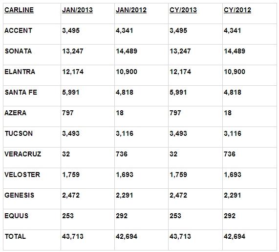 February 1, 201313 yr Hyundai Motor America Reports Record January Sales COSTA MESA, Calif., Feb. 1, 2013 /PRNewswire/ -- Coming off a record 2012 sales year, Hyundai Motor America today announced a continuation of that momentum by setting a new all-time record for January sales with 43,713 units, up 2.4 percent versus 2012. Improved availability on key volume vehicles at Hyundai dealers across the nation played a substantial role in achieving yet another all-time monthly sales record. Fleet mix was 15 percent for the month. The same trend held true with Hyundai Certified Pre-Owned (CPO) vehicle sales as 2012's record January was immediately eclipsed this year with a best ever 5,393 CPO units, up 16.8 percent versus 2012. "Despite some lingering economic concerns, January turned out to be a solid first month for us," said Dave Zuchowski , executive vice president, national sales. "The all-new Santa Fe Sport, recently named Best New Crossover in Kiplinger's Personal Finance magazine and the Elantra GT, Best New Car Under $20,000, both continue to do quite well with the Santa Fe selling 5,991, and the Elantra family totaling 12,174, up 24.4 percent and 11.7 percent, respectively, over the same period last year. We look forward to adding the all-new seven passenger Santa Fe to our line-up next month, allowing growing families an opportunity to experience the Hyundai brand." "We've got a solid foundation going into the new year," said John Krafcik , president and CEO, Hyundai Motor America. "We've got a great line-up of vehicles and we're looking forward to Super Bowl Sunday when we'll share with upwards of 110 million viewers our all-new Santa Fe, our premium Genesis sedan and the surprising Sonata 2.0T."