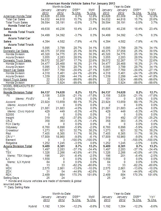 February 1, 201313 yr Honda January Sales Gain Powered by Award-Winning Accord; Acura Sales Increase Again Fueled by RDX and ILX Honda Division sales up 12.7 percent, Acura sales up 13.2 percent 02/01/2013 - TORRANCE, Calif. - American Honda today reported January 2013 U.S. sales of 93,626 units, an increase of 12.8 percent compared with January 2012. The Honda brand posted January 2013 sales of 84,137 units, an increase of 12.7 percent compared with January 2012. Acura U.S. January sales of 9,489 units increased 13.2 percent compared with January 2012. Sales of the all-new 2013 Honda Accord were up more than 75 percent from last year - with 10,000 more Accords sold this January than in January 2012. The totally revised Accord has already become one of the most decorated vehicles in Honda history, garnering a host of awards that include being named for a record 27th time to Car and Driver magazine's 10Best Cars list, as well as winning key comparison tests against its mid-size rivals in comparisons from Car and Driver and Cars.com/USA Today/"MotorWeek". Honda Sales of the all-new Accord are up 75.2 percent from last January with sales of 23,924 units Reflecting key changes, the new 2013 Crosstour sees sales jump 38.2 percent from last January Pilot sales are up 16.3 percent compared with last January, with sales of 7,405 units "The all-new Accord has the Honda brand right where we left off in 2012 - powering significant sales gains in the new year," said John Mendel, American Honda executive vice president of Sales. "With our strongest vehicle lineup ever and continued sales momentum, we're optimistic 2013 will be a great year for the Honda brand." Acura RDX sets its ninth-consecutive monthly sales record, up over 181.6 percent from last January with sales of 2,489 units MDX was the top selling Acura model in January, with sales of 2,575 units ILX was again the top selling Acura sedan in January with sales of 1,558 units "Acura's newest products continue to drive our sales momentum as we begin a new year," said Jeff Conrad, vice president of Acura Sales. "With the positive reception of the all-new Acura MDX Prototype in Detroit, and the upcoming launch of our new flagship RLX sedan, Acura is poised for even greater success in 2013." The daily selling rate (DSR) is calculated with 25 days for January 2013 and 24 days for January 2012. Year-to-date, the DSR is calculated with 25 days for 2012 and 24 days for 2011. All percentages in release are unadjusted; see table for adjusted DSR figures.
