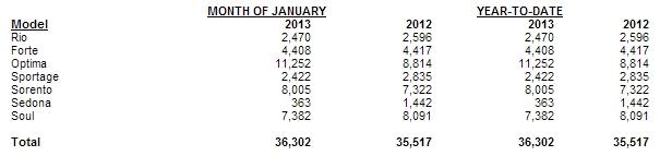 February 1, 201313 yr Kia Motors America Posts Record January Sales Optima and Sorento Top Monthly Sales for the Sixth Straight Month IRVINE, Calif., Feb. 1, 2013 /PRNewswire/ -- Kia Motors America (KMA) today reported an all-time record January with 36,302 vehicles sold, a 2.2-percent increase over the same period in 2012. The U.S.-built* Optima midsize sedan and Sorento CUV continued to lead sales for the brand with 11,252 and 8,005 units sold respectively, sustaining the company's momentum at the beginning of a new year that will see the arrival of several all-new or significantly redesigned vehicles. "January's record performance comes on the heels of the historic sales milestones Kia achieved in 2012 and signals the beginning of an aggressive launch cadence that will deliver a collection of new cars and CUVs, fulfilling our promise to advance value to new levels of sophistication," said Byung Mo Ahn , group president and CEO of KMA and Kia Motors Manufacturing Georgia. "Customers continue to flock to our showrooms in search of vehicles that represent a smart buy with world-class style, modern amenities and cutting-edge technologies."