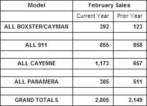 March 1, 201313 yr Porsche Reports February Sales Increase of 31 Percent Cayenne Sales up 79 percent from February 2012 ATLANTA, March 1, 2013 /PRNewswire/ -- Porsche Cars North America, Inc. (PCNA), importer and distributor of Porsche sports cars, Cayenne SUVs and the Panamera four-door sports sedan line-up in the United States, today announced February sales of 2,805 vehicles. This compares to 2,149 vehicles sold in February 2012, an increase of 31 percent. For the year so far, PCNA has delivered 6,163 vehicles versus 4,699 during the same period last year, also an increase of 31 percent. Cayenne sales were particularly strong, posting an increase of 79 percent to 1,173 units, up from 657 in February 2012. Demand for the new Boxster also continues to be significant, which contributed to sales of 391 units, a tenfold increase from the same period last year. "Demand for our products remained robust in February, continuing the momentum from our 2012 sales record," said Detlev von Platen, President and CEO, Porsche Cars North America. "Rising interest in the Cayenne Diesel as well as the first sales of the new flagship Cayenne Turbo S boosted Cayenne. Even with the strong demand for Cayenne, nearly 45 percent of our sales in February were two-door sports cars, which were bolstered by the new Boxster and deliveries of the new 911 Carrera 4 models." Porsche Approved Certified Pre-Owned vehicle sales were 768 for February 2013, an increase of 11 percent over February 2012 (693).