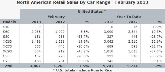March 1, 201313 yr Volvo Announces February Sales ROCKLEIGH, N.J. (March 1, 2013) - Volvo Cars of North America, LLC, (VCNA) reported U.S. sales of 4,867 units, a 7.5 percent decrease from February 2012. Year-to-date sales are up 0.2 percent over the first two months of 2012. The S60 sports sedan, one of two midsize luxury vehicles to earn IIHS' inaugural Top Safety Pick+ award, was the top seller for the month with 2,036 units sold, followed by the XC60 crossover with 1,496 units sold.