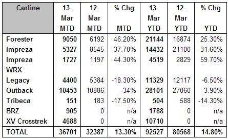 April 2, 201312 yr SUBARU REPORTS MARCH 2013 SALES AS BEST SALES MONTH IN COMPANY HISTORY March sales of 36,701 represent best-ever sales month for Subaru of America Cherry Hill, N.J., Apr 2, 2013 - Subaru of America, Inc. today reported 36,701 vehicle sales for March 2013, which represents the best-ever sales month for the company and a 13 percent increase over March 2012. Year-to-date sales for Subaru total 92,527 – a 15 percent increase over the same period in 2012 and represent the best first quarter in company history. These results build on strong sales from 2012 where Subaru achieved five consecutive years of sales increases and exceeded 300,000 annual sales in 2012 – a first in company history. During the 2013 New York International Auto Show, Subaru achieved another company first when it introduced the XV Crosstrek Hybrid, the brand’s first-ever hybrid vehicle. BRZ sales were notably strong as were sales of the all-new 2014 Forester. The XV Crosstrek Hybrid is based on the popular XV Crosstrek crossover that achieved 4688 sales in March 2013 and 10,710 year-to-date sales. The 2014 XV Crosstrek Hybrid is the most fuel-efficient all wheel drive crossover in America. It will go on sale in the fall. “We are pleased to see our sales growth continue and surpass the records we set last year,” said Thomas J. Doll, president and chief operating officer, Subaru of America, Inc. “Subaru offers customers uncompromising driving performance and green capabilities. It is a winning combination that will continue to drive sales.” “Subaru achieved record first-quarter sales with a strong product lineup,” said Bill Cyphers, senior vice president of sales, Subaru of America, Inc. “Bringing a hybrid vehicle to market will give our retailers an additional offering for shoppers.”