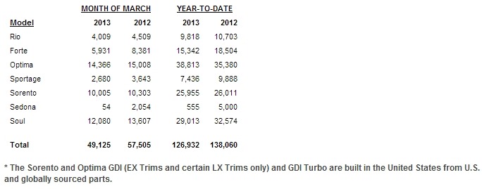 April 2, 201312 yr Kia Motors America Announces March Sales Kia Completes Second-Best First Quarter in Company History; All-New 2014 Forte Compact Sedan Set to Begin Arriving In Dealerships This Month IRVINE, Calif., April 2, 2013 /PRNewswire/ -- Kia Motors America (KMA) today reported March sales of 49,125 units on the heels of the world debut of three stylish and technology-laden new vehicles last week at the New York International Auto Show. March sales contributed to KMA's second-best first quarter sales in company history. The U.S.-built* Optima midsize sedan led sales for the 16th consecutive month with 14,366 units sold, while the Sorento CUV also built in West Point, Georgia*, and the Soul urban passenger vehicle also posted strong sales. Kia is set to deliver seven all-new or significantly redesigned vehicles this calendar year, including the all-new 2014 Sorento, which arrived in dealerships in February and the all-new 2014 Forte compact sedan, scheduled to arrive in dealerships in April. The all-new 2014 Soul and 2014 Forte Koup, and the updated 2014 Optima - all introduced in New York - are scheduled to arrive in late-summer/early-fall. With the 2014 Forte sedan going on sale soon, the next addition to the Kia lineup will be the 2014 Cadenza, the most powerful and technologically-advanced vehicle Kia has introduced in the U.S. market to date.