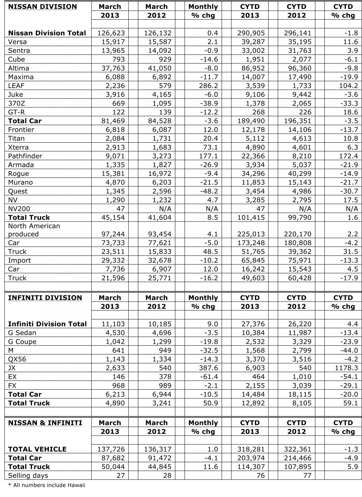 April 2, 201312 yr Nissan Has Best-Ever U.S. Sales Month in March -Nissan LEAF has best month since launch; Pathfinder sales jump 177.1% --Infiniti sales grow 9% on strength of crossover and SUV sales- NASHVILLE, Tenn. – Nissan North America, Inc. (NNA) today reported March U.S. sales of 137,726 units, up 1 percent from last year's total of 136,317 and marking the best month in NNA history. Nissan Division also posted its highest volume month ever, with 126,623 deliveries, up 0.4 percent. Infiniti deliveries totaled 11,103, up 9 percent from last March. NISSAN HIGHLIGHTS Nissan LEAF sales totaled 2,236 deliveries, up 286.2 percent and the nameplate's best month since launch. March marks the first full month of deliveries of the lower-priced 2013 LEAF, now produced at Nissan's assembly plant in Smyrna, Tenn. Price-competitive with traditional cars in its segment, LEAF is the best-selling pure electric vehicle in the world. Sales of the all-new Pathfinder SUV totaled 9,071, up 177.1 percent, setting a new March record. Year-to-date Pathfinder sales, which launched in November 2012, are up 172.4 percent. Nissan Altima totaled 37,763 in March on higher retail and lower fleet sales than year-ago levels. Nissan Versa sales finished at 15,917, up 2.1 percent and establishing a new March record for the nameplate. Versa is the best-selling sub-compact in the U.S. Nissan NV sales finished March at 1,290, the best month ever for the large commercial vans. Nissan's core volume models like Altima, Pathfinder and Versa are delivering the value, performance, style and innovation that consumers want. With strong retail demand for Altima, Pathfinder up almost 180 percent and the U.S.-built all-electric LEAF having its best month since launch, Nissan had its best month in history. INFINITI HIGHLIGHTS Contributing to Infiniti's increase in March were its luxury crossovers and sport utility vehicles, which were up 50.9 percent. The Infiniti JX 7-passenger luxury crossover, which was launched exactly one year ago, had sales of 2,633 units in March, an increase of 387 percent over prior year. NOTE: To ensure consistency in global sales reporting, Nissan North America calculates monthly variances on a straight-percentage basis, unadjusted for the number of selling days. February had 27 selling days in 2013 and 28 selling days in 2012.