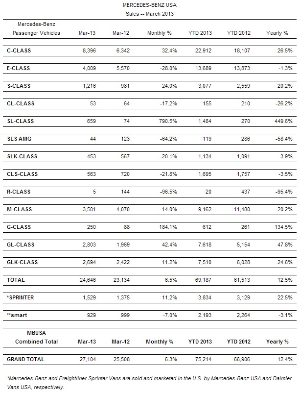 April 2, 201312 yr Top March Sales Of 24,646 Take Mercedes-Benz To Highest First Quarter Ever At 69,187 Record quarter for MBUSA at 75,214 up 12.4% for the year MONTVALE, N.J., April 2, 2013 /PRNewswire/ -- Mercedes-Benz USA (MBUSA) today reported the highest first quarter sales volume in its history. March was another record month with sales of 24,646 for its Mercedes-Benz models, a 6.5% increase over March 2012, resulting in year-to-date sales of 69,187, up 12.5%. Combined sales of Mercedes-Benz passenger vehicles, smart and Sprinter for the month totaled 27,104, up 6.3%, and year-to-date up 12.4 % at 75,214. "We're coming out of our highest first quarter on record—and that's before launching a single new product," said Steve Cannon , president and CEO of MBUSA. "With completely redesigned E-Class models arriving at dealerships, a next generation S-Class and a new entry point for the brand—the CLA—in the wings, we're looking at our strongest year on record." Mercedes-Benz March sales were driven by the C-, E-, and M-Class model lines. The sporty C-Class – the current gateway to the brand on the car side for younger and first-time Mercedes-Benz buyers – took the lead, posting sales of 8,396, up 32.4%. The 9th generation E-Class followed with sales of 4,009 and MBUSA's top-selling SUV, the M-Class, rounded out the top three with sales of 3,501. At the high-end, strong performers were the company's flagship S-Class, which saw 24.0% growth, and the SL-Class, which increased 790.5% over March 2012. On a year-to-date basis, the top performers again were the C-Class with 22,912, the E-Class with 13,689 and the M-Class with 9,162. The Sprinter model line also continued its record sales streak in March with 1,529 vans sold – up 11.2% over last year and up 22.5% on a year-to-date basis, while the company's smart brand recorded sales of 929 vehicles. Sales of the high-performance AMG models were 631 for the month and sales of the company's BlueTEC diesel models finished the month at 1,640, up 2.4% over the same period last year. Separately, through the Mercedes-Benz Certified Pre-Owned (MBCPO) program, MBUSA sold 8,670 vehicles in March; an increase of 24% when compared to March 2012 (sales of 6,994 vehicles). On a year-to-date basis, MBCPO sold 24,370 vehicles, an increase of 22% over the comparable period (with sales of 19,924 vehicles).