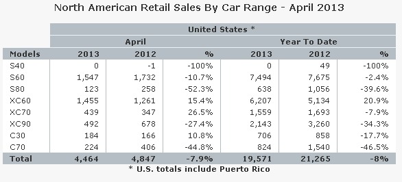 May 1, 201312 yr Volvo Announces April Sales ROCKLEIGH, N.J. (May 1, 2013) - Volvo Cars of North America, LLC, (VCNA) reported U.S. sales of 4,464 units, a 7.9 percent decrease from April 2012. Year-to-date sales are down 8 percent over the first four months of 2012. The S60 sports sedan was the top seller for the month with 1,547 units sold. The XC60 crossover, currently the only luxury SUV to earn IIHS' Top Safety Pick+ award, finished the month right behind with 1,455 units sold, up 15.4 percent versus April 2012.
