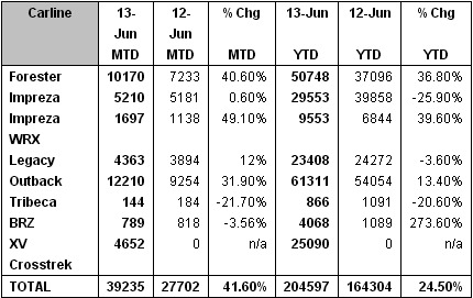 July 2, 201312 yr July 2, 2013 SUBARU REPORTS 42 PERCENT INCREASE IN JUNE SALES; BEST-EVER JUNE FOR FORESTER AND OUTBACK Subaru reaches 200,000 vehicle sales during the first six months of 2013 – a record-setting pace Cherry Hill, N.J. - Subaru of America, Inc. today reported 39,235 vehicle sales for the month of June, a 42 percent increase over June 2012. The company also posted best-ever June sales for Forester and Outback models. Year-to-date sales for Subaru total 204,597 – 25 percent higher than the same period in 2012. June Forester sales totaled 10,170, a 41 percent increase over June 2012 and best-ever June for the model. The 2014 Forester was recently named a 2013 Top Safety Pick+ by the Insurance Institute for Highway Safety (IIHS). The 2014 Subaru Forester is also the highest-safety-rated small SUV by IIHS. June was also a record month for Outback sales. Monthly sales for the popular Outback model totaled 12,210, 32 percent higher than June 2012. “We are thrilled to close the first half of 2013 with such record numbers,” said Thomas J. Doll, president and chief operating officer, Subaru of America, Inc. “Our products are being well-received and we are looking forward to adding Subaru’s first-ever hybrid vehicle to our product line-up later this year.” “Subaru sold more than 200,000 vehicles in six months, which is a record setting pace for our brand,” said Bill Cyphers, senior vice president of sales, Subaru of America, Inc. “Consumers are looking for safety, versatility and durability; shoppers are finding that in Subaru showrooms.”