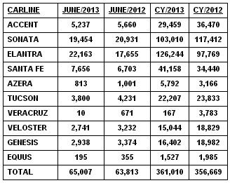 July 2, 201312 yr Hyundai Motor America Reports Best June And Mid-Year Sales Ever Elantra up 26 percent for the month Santa Fe, Automobile Magazine's Family Crossover for 2013, up 14 percent for the month COSTA MESA, Calif., July 2, 2013 /PRNewswire/ -- Hyundai Motor America today announced sales of 65,007 units, up two percent versus the same period in 2012 and up one percent the first six months of the year. "June was another record-breaking sales month for us in what has been a strong first half of the year," said Dave Zuchowski, executive vice president of national sales. "We clearly felt the impact of the summer selling surge and our improved availability of award-winning vehicles was perfectly timed. Important third-party accolades, such as Genesis taking J.D. Power's trophy for highest initial quality in the midsize premium car segment and the all-new Santa Fe being named Automobile Magazine's Family Crossover for 2013, also continue to build strong momentum for our brand." "With all of our plants continuing to operate at maximum capacity, sales of the U.S.-built Elantra soared 26 percent over June 2012," said John Krafcik, president and CEO of Hyundai Motor America. "Our Hyundai Assurance Connected Care program, now free for three years on most Hyundai models, continues to draw customers to our website and showrooms." Fleet mix registered about 19 percent for the month. Certified Pre-Owned vehicle sales were 6,775 a June record, up 7.5 percent over June 2012.