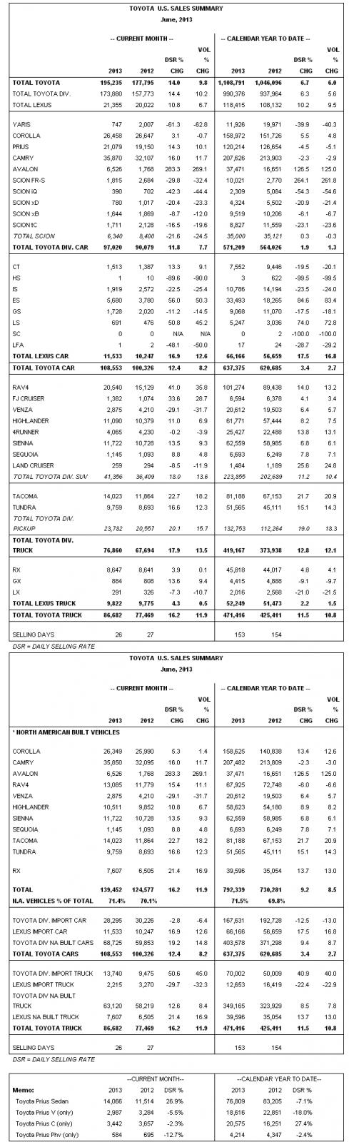 July 2, 201312 yr July 02, 2013 Toyota Motor Sales Paces Ahead of the Industry in June Toyota Division Hybrids Set Record June; Camry Eclipses 10 Millionth Sale TORRANCE, Calif. (July 2, 2013) – Toyota Motor Sales (TMS), U.S.A., Inc., today reported June 2013 sales results of 195,235 units, an increase of 14 percent over June 2012 on a daily selling rate (DSR) basis. On a raw-volume basis, unadjusted for 26 selling days in June 2013 versus 27 selling days in June 2012, TMS sales increased 9.8 percent from the year-ago month.Toyota Division posted June 2013 sales of 173,880 units, up 14.4 percent year-over-year on a DSR basis. On a raw volume basis, Toyota Division sales were up 10.2 percent over the year-ago month. For the first half of the year, TMS reported sales of 1,108,791 units. With 153 selling days in the first half of 2013 versus 154 selling days during the same period in 2012, sales were up 6.7 percent on a DSR basis. Unadjusted, sales were up 6 percent year-over-year.“The auto industry led the economic recovery through the first half of 2013, kicking off a strong summer selling season, which we expect will carry into the second half of the year," said Bill Fay, Toyota Division group vice president and general manager. "Sales in June were solid, and demand didn’t skip a beat. Customers are already showing an interest in the all-new Corolla, our hybrid lineup had its best-ever June and Camry topped 35,000 units.”Lexus reported June 2013 sales of 21,355 units, up 10.8 percent on a DSR basis, and up 6.7 percent over last year on a raw volume basis.“Thanks to the 2014 Lexus IS that went on sale last Friday, we had our best non-holiday weekend in six years,” said Steve Hearne, Lexus sales vice president. “With its bold design and sporty performance, the new F SPORT model is proving to be a homerun at our dealerships. With the new IS, as well as the strong-selling ES and LS models, Lexus has three of the hottest cars in the luxury segment.”Other Highlights: TMS hybrid June sales increase 19 percent Toyota Division No. 1 retail brand for fourth consecutive month Camry is best-selling car in America with best June since 2008 Prius family sales up 10 percent for the month All-new Avalon sales nearly tripled for the month All-new RAV4 sales up about 36 percent for its best-ever June Toyota Division trucks increased nearly 14 percent in June, slightly ahead of segment Sienna up more than 9 percent with sales of 11,722 units for the month Highlander up 7 percent with sales of 11,090 units for the month Tacoma and Tundra post double-digit gains, with June sales of 14,023 and 9,759, respectively Lexus sales increase nearly 7 percent in June and 9.5 percent in first half Lexus ES up 50 percent in June and up 83 percent in first half Lexus LS up 45 percent in June and up 73 percent in first half RX continues to lead luxury utility vehicle segment with sales of more than 8,600 units in June