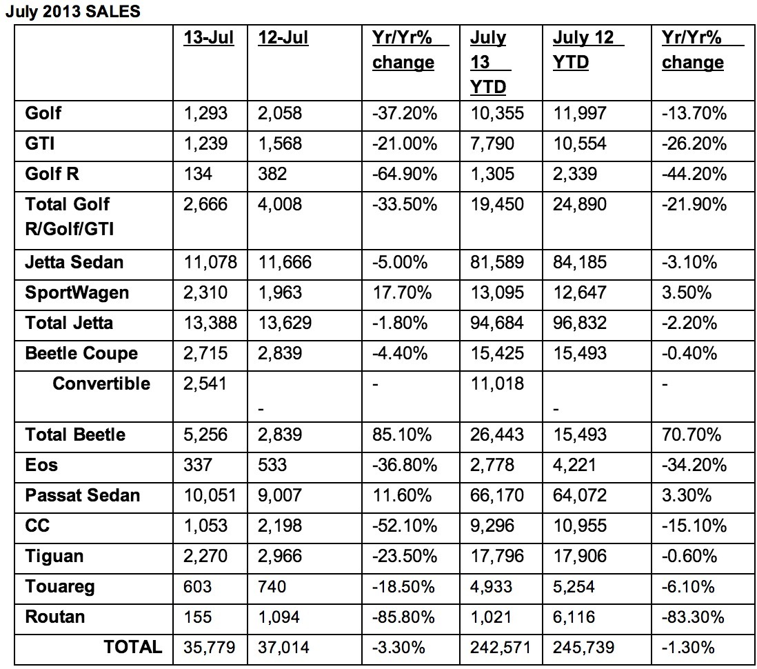 August 1, 201312 yr 08.01.2013 VOLKSWAGEN OF AMERICA REPORTS JULY 2013 SALES - Best-ever July and year-to-date results for Passat and TDI® Clean Diesels - Best July and year-to-date for Passat with 10,051 and 66,170, units respectively Jetta Sedan delivered strong results in July with 11, 078 units sold Total Beetle units in July up 85.1 percent with 5,256 units delivered High-mileage, TDI® Clean Diesel models accounted for 29.9 percent of sales in July and 23.3 percent of sales year-to-date, the best July and year-to-date results on record Passat TDI sales reach 39.8 percent of mix with 3,997 units representing the best July and year-to-date results ever Volkswagen’s July sales total 35,779 units, representing a 3.3 percent decrease versus the prior year Herndon, VA - Volkswagen of America, Inc. (VWoA) today reported 35,779 units delivered in July, a 3.3 percent decrease over prior year sales and a 1.3 percent year-to-date decrease versus the prior year.“We continue to see a healthy demand for the Volkswagen brand, despite the fact that we are entering a period of consolidated growth as we phase out 2013 Model Year vehicles,” said Mark McNabb, Chief Operating Officer, Volkswagen of America, Inc. “While we remain cautious in terms of the economic outlook, we are confident in the strength of our product offerings, particularly as we gear up for the 2014 Model Year introductions which bring a host of new innovations to the market.”The Chattanooga-built Passat continued to show strong results with 10,051 units delivered an increase of 11.6 percent. The Passat, which celebrated its 40th year of global production in July, continues to demonstrate its strength in the marketplace as it was recently awarded the most appealing Midsize Car in the J.D. Power 2013 Automotive Performance, Execution and Layout (APEAL) Study. This is the second year in a row that the Passat has ranked highest in the hotly contested mid-size sedan segment. Nearly 40 percent of the Passat’s sold in July were TDI® Clean Diesels. Total Jetta deliveries (including SportWagen) for July accounted for 13,388 units. The Jetta Turbo Hybrid continues to attract consumer interest with 417 deliveries in July.Total Beetle deliveries for July were 5,256 units, an 85.1 percent increase versus the prior year. This month, the 1970’s-inspired, limited-edition Beetle GSR will hit dealer showrooms. The Beetle GSR will also feature the EA888 turbocharged and direct-injection 2.0-liter TSI® engine, giving the vehicle more power, more torque and better fuel economy. Total sales of the Golf (including Golf R and GTI) were 2,666 units. The Volkswagen GTI, ranked highest in the Compact Sporty Car segment in the J.D. Power 2013the APEAL Study. The Tiguan and Touareg sold 2,270 and 603 units respectively. Volkswagen’s high-mileage, TDI® Clean Diesel models accounted for 29.9 percent of sales in July, and 23.3 percent year-to-date, the best July and year-to-date results ever.