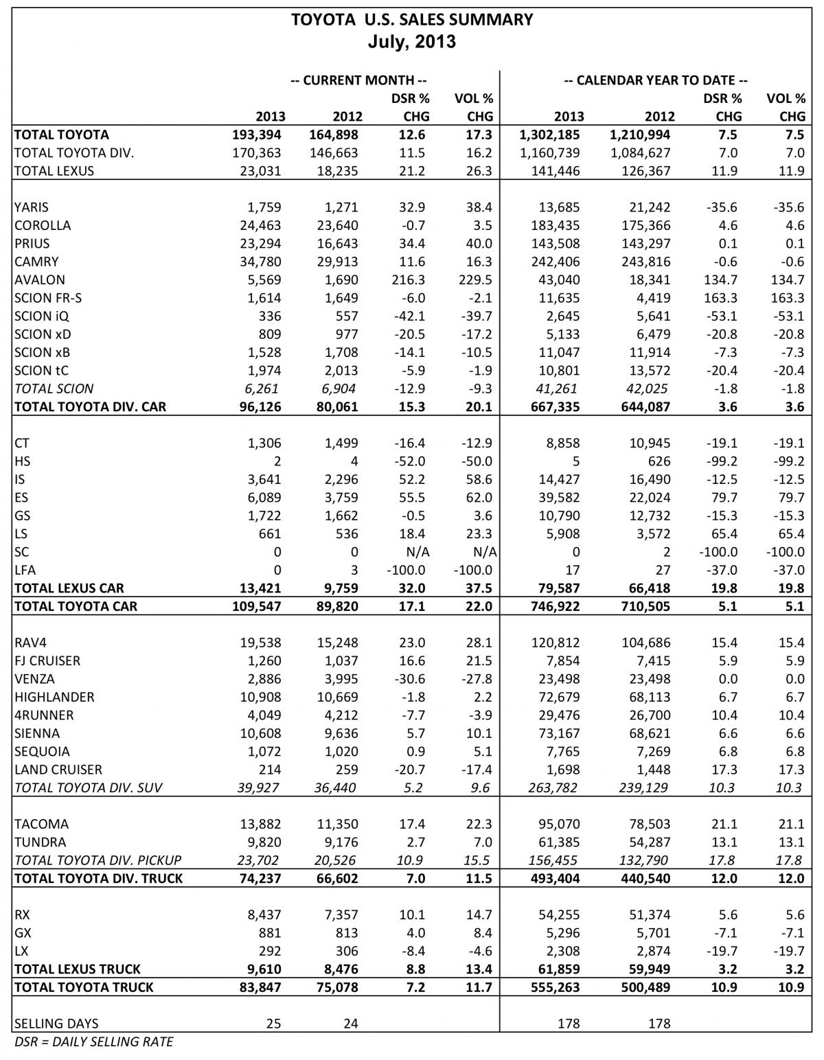 August 1, 201312 yr August 01, 2013 Toyota Motor Sales Reports 17 Percent Sales Increase in July 2013 Prius family has best-ever July; Toyota Division pickups increase 15.5 percent TORRANCE, Calif. (August 1, 2013) – Toyota Motor Sales (TMS), U.S.A., Inc., today reported July 2013 sales results of 193,394 units, an increase of 12.6 percent over July 2012 on a daily selling rate (DSR) basis. On a raw-volume basis, unadjusted for 25 selling days in July 2013 versus 24 selling days in July 2012, TMS sales increased 17.3 percent from the year-ago month.Toyota Division posted July 2013 sales of 170,363 units, up 11.5 percent year-over-year on a DSR basis. On a raw volume basis, Toyota Division sales were up 16.2 percent over the year-ago month."Solid industry sales in July point to a stable market indicating a recovering economy,” said Bill Fay, Toyota division group vice president and general manager. “Consumer confidence also maintained elevated levels as evidenced by strong retail sales. For Toyota, we saw growth year-over-year with July sales up more than 16.5 percent.”Lexus reported July 2013 sales of 23,031 units, up 21.2 percent on a DSR basis, and up 26.3 percent over last year on a raw volume basis."The all-new IS is off to a great start in attracting new, younger male customers to the Lexus brand," said Jeff Bracken, Lexus group vice president and general manager. "With new products such as the IS and widespread availability of core models including the ES and RX, we are looking forward to a strong August to set the pace for the rest of the year."Other Highlights: Toyota Division No. 1 retail brand for fourth consecutive month Camry is best-selling car in America with best July since 2010 TMS hybrid sales increase about 37 percent and hold more than 60 percent market share Prius family posts double digit gains for best July ever All-new Avalon posts triple digit gains All-new RAV4 sales up more than 28 percent for sixth consecutive record-setting month Sienna up more than 10 percent, topping 10,000 units Toyota Division pickups increase 15.5 percent Tacoma and Tundra increase 22.3 and 7 percent, respectively All-new Lexus IS posts triple digit gains month-over-month Lexus ES up 62 percent Lexus LS up more than 23 percent RX leads luxury utility vehicle segment with sales of more than 8,400 units