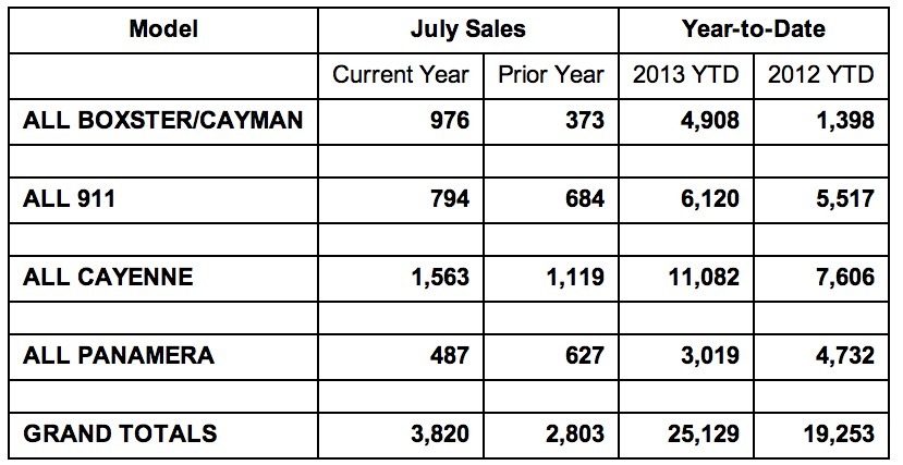 August 1, 201312 yr Porsche Reports Best July Sales Ever - Up 36 percent over 2012 Porsche dealers sell 3,820 vehicles in July ATLANTA, Aug. 1, 2013 /PRNewswire/ -- Porsche Cars North America, Inc. (PCNA), importer and distributor of Porsche sports cars, Cayenne SUVs and the Panamera four-door sports sedan line-up in the United States, today announced July 2013 sales of 3,820 vehicles, an increase of 36 percent over July 2012. For the year, Porsche has sold 25,129 cars in the U.S., a 31 percent increase over last year's sales (19,253). The recently-launched Boxster/Cayman line posted an impressive 162 percent increase over July 2012, and a 251 percent increase year-to-date. Sales of the Cayenne line also increased significantly YTD, by 46 percent (11,082 units). The 911 line, which is celebrating its 50th anniversary this year, remained strong, with 6,120 sold so far in 2013 – up 11 percent over the same period last year. "In addition to enjoying a successful sales month, we were also recently recognized as the top brand in the annual J.D. Power APEAL Study -- for the ninth consecutive year," said Detlev von Platen, President and CEO, Porsche Cars North America, Inc. "This provides a compelling message as we plan for bringing the new Panamera line, including our first plug-in hybrid, to the U.S. market this fall."
