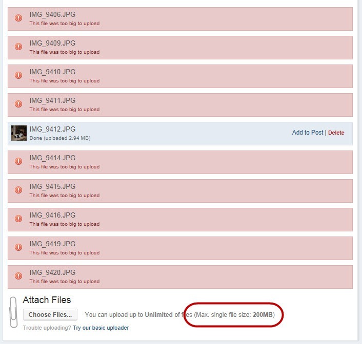 October 16, 201312 yr Author Weird, I was going to throw up 10 pics before I head out the door and they are all around 3 to 3.5mb in size and the limit is 200MB on a single file. Drew any idea why?