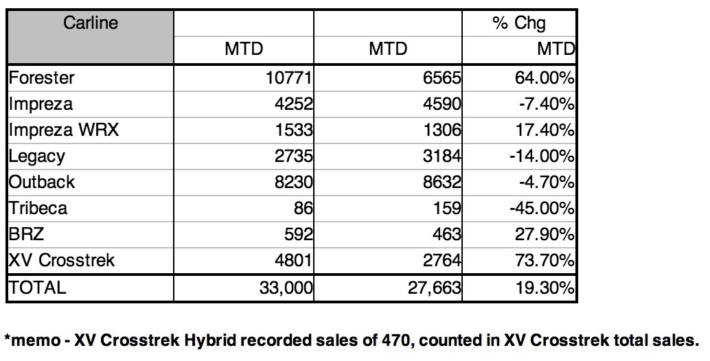 February 3, 201412 yr Subaru Sets January Sales Record Automaker carries sales momentum into new year Forester sets January record - up 64% XV Crosstrek sets January record - up 74% CHERRY HILL, N.J., Feb. 3, 2014 /PRNewswire/ -- Subaru of America, Inc. has announced record January sales as it looks to continue its strong sales performance into 2014. The company, which has set sales records for the past five consecutive years, announced its best ever January sales of 33,000 vehicles, a 19% increase over January 2013. Increased availability of the strong selling Forester and Crosstrek models helped sales as both models continued their strong performances. Subaru expects this sales momentum to continue throughout the year, with the recently announced all-new 2015 Legacy mid-size sedan set to debut at the Chicago auto show this month and more new models due to launch later in 2014. Thomas J. Doll, president and COO of Subaru of America said; "It's great to start the year off in such positive fashion. Attending the National Automotive Dealer Association meeting last month, we could see that our retailers are in a buoyant and positive mood. We have a lot to look forward to in 2014." William H. Cyphers, senior vice president of sales said; "Our crossover models are the mainstay of our growth but we expect our sedan models to follow that trend in 2014 with the launch of the all-new Legacy which will take that model into new territory."
