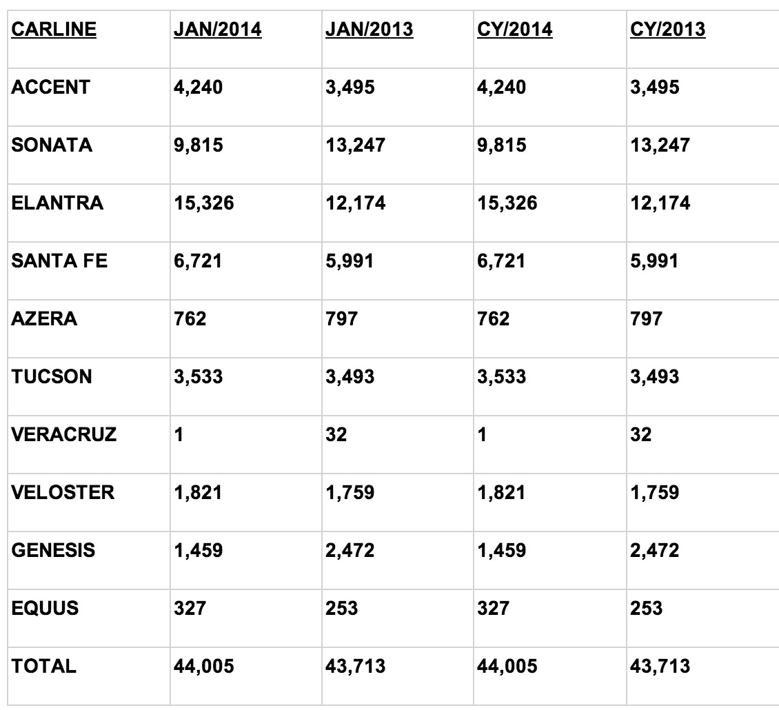 February 3, 201412 yr Hyundai Motor America Reports Record January Sales Accent, Elantra and Equus all up more than 20 percent FOUNTAIN VALLEY, Calif., Feb. 3, 2014 – Hyundai Motor America today reported its best January in company history, selling 44,005 units for the month, up less than one percent versus the same period last year. “While year-over-year sales were up slightly, January was a bit of a challenge due to weather issues across the country, making us wonder how many more units we could have sold,” said Bob Pradzinski, vice president, national sales. “Even with our Alabama plant shutting down production of Elantra and Sonata for a couple of days, due to a winter snow storm that crippled Montgomery, our dealers are well stocked with a full lineup of vehicles ready to support customer demand.” Leading the way were Accent, Elantra and Santa Fe with sales up 21, 26 and 12 percent, respectively. Equus experienced sales of 327 units for the month, up 29 percent.