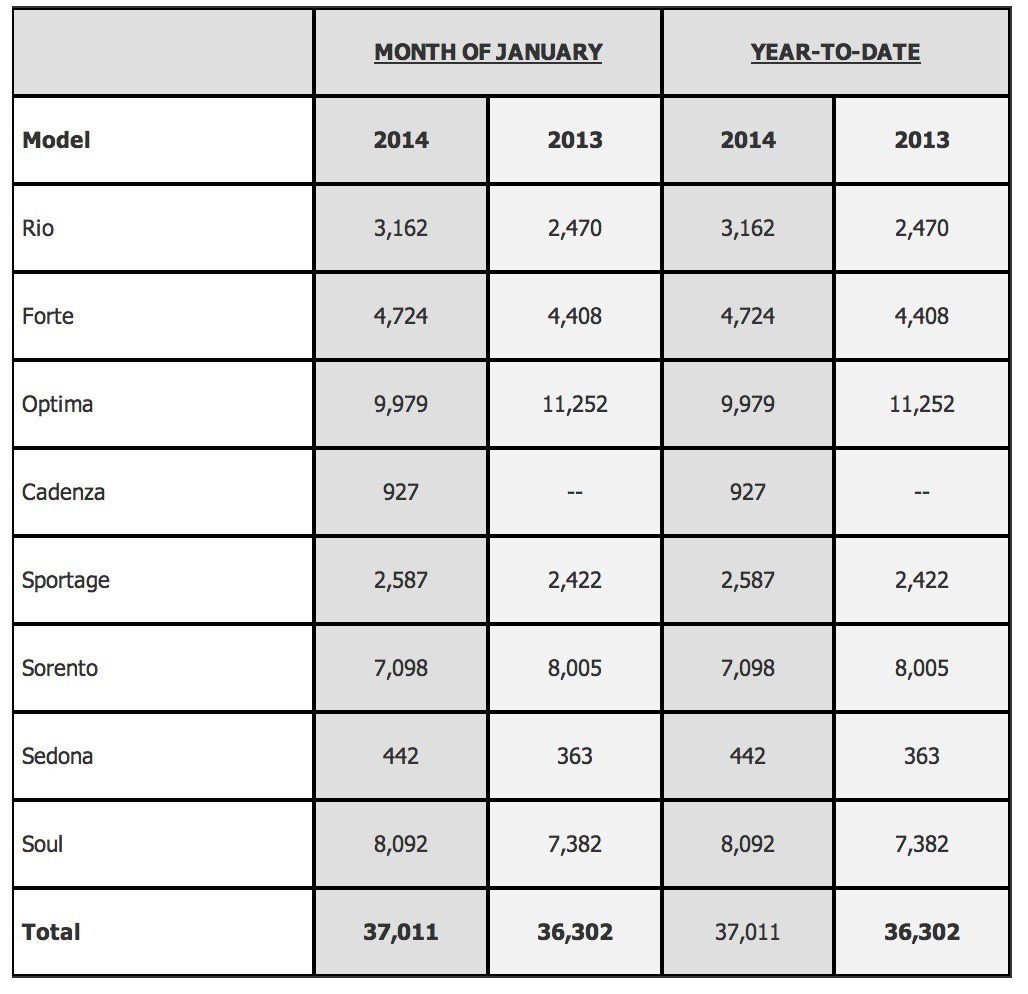 February 3, 201412 yr KIA MOTORS AMERICA POSTS RECORD JANUARY SALES Optima and Soul Lead Sales; All-New K900 Flagship Sedan Arrives in Showrooms this Spring IRVINE, Calif., February 3, 2014 – Kia Motors America (KMA) today reported record January sales of 37,011 vehicles, led by the U.S.-built* Optima midsize sedan and the totally transformed Soul, with 9,979 and 8,092 units sold, respectively. After delivering seven all-new or significantly redesigned vehicles in 2013, the brand’s aggressive new product cadence continues this year as part of a long-term strategy to concentrate on quality, strengthen the brand and elevate the ownership experience. The scheduled arrival of the all-new K9001 rear-wheel-drive flagship sedan this Spring symbolizes how far Kia has come over the last two decades and will usher in a new era for the brand. Kia’s first-ever electric vehicle – the Soul EV – and all-new Sedona minivan will also go on-sale this year. The multi-platform marketing campaign for the K900 continued during Sunday’s Big Game with a 60-second spot titled “The Truth,” showcasing the luxury sedan as something modern and different for the growing number of people who don’t want to be confined by the traditional definitions of luxury. A phased rollout of additional elements, including broadcast, cinema, digital, print, experiential, social media and CRM components, will follow.