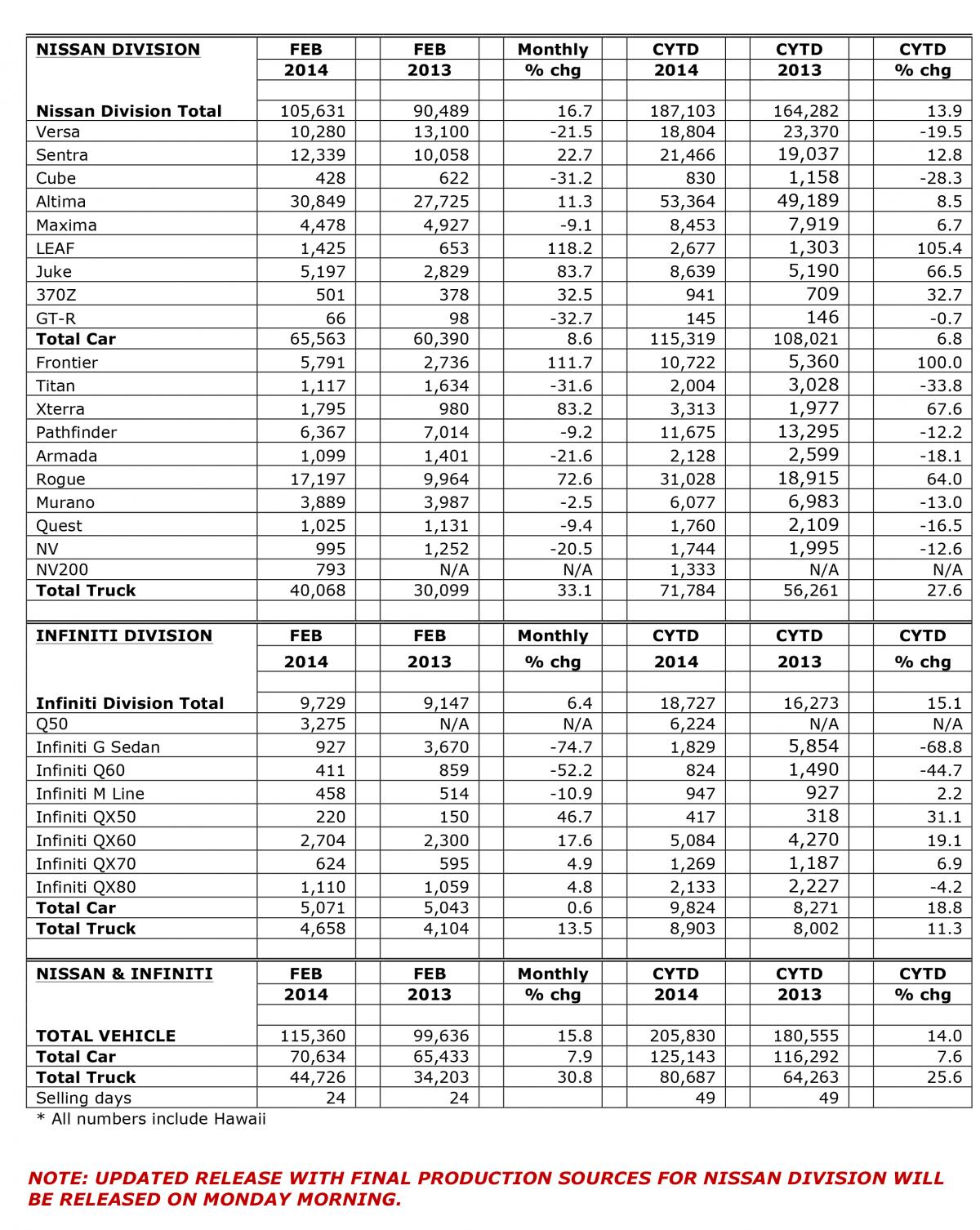 March 3, 201412 yr Nissan Group Reports February 2014 U.S. Sales NASHVILLE, Tenn. – Nissan Group announced today total U.S. sales for February 2014 of 115,360 units, an increase of 15.8 percent compared to last year. Nissan Division highlights: Nissan set a February record with 105,631 deliveries, an increase of 16.7 percent over the prior year. This marks a monthly record for Nissan division in 11 of the last 12 months. Rogue crossover sales also set a February record up 72.6 percent with 17,197 deliveries in the month. February marked the third full month of sales for the all-new 2014 Rogue, which is now being built at Nissan's Smyrna, Tenn. assembly plant. Sales of the all-electric Nissan LEAF set a February record, increasing 118.2 percent to 1,425. Nissan Altima sales totaled 30,849 units in February, an increase of 11.3 percent. Sales of the Nissan Frontier pickup rose 111.7 percent to 5,791 units. Nissan Juke sales set an any-month record at 5,197, up 83.7 percent. Sentra sales were up 22.7 percent to 12,339 vehicles.