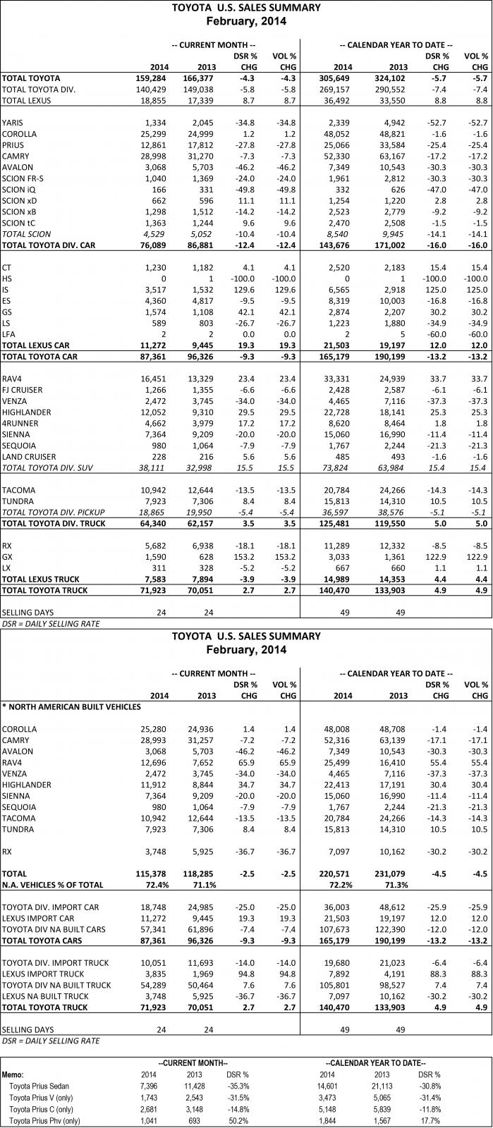 March 3, 201412 yr Retail Customers Propel Toyota's February 2014 Sales Lexus up about 9 percent; All-new Highlander and RAV4 post double-digit gains for best-ever February TORRANCE, Calif. (March 3, 2014) – Toyota Motor Sales (TMS), U.S.A., Inc., today reported February 2014 sales results of 159,284 units, a decrease of 4.3 percent from February 2013 on both a daily selling rate (DSR) and raw-volume basis.Toyota division posted February 2014 sales of 140,429 units, down 5.8 percent year-over-year on both a DSR and raw-volume basis. “February auto sales emerged from a chill in the second half of the month, poising the industry for a strong March,” said Bill Fay, Toyota division group vice president and general manager. “Boosted by consumer interest and strong truck sales, Toyota led retail sales this month.”Lexus reported February sales of 18,855 units, an 8.7 percent increase on both a DSR and raw-volume basis."The luxury segment is off to a good start this year, showing across the board gains," said Jeff Bracken, Lexus group vice president and general manager. "The new IS continues to be one of the hottest cars in any segment, with sales more than doubling for the fourth straight month."Other Highlights: Toyota division is no. 1 retail brand Camry posted sales of 29,000 units All-new Corolla records sales of more than 25,000 units Toyota division trucks up 3.5 percent All-new RAV4 up more than 23 percent; best-ever February All-new Highlander up nearly 30 percent; best-ever February 4Runner up 17 percent All-new Tundra up more than 8 percent Lexus cars up more than 19 percent All-new Lexus IS posts triple-digit gains Lexus GS up more than 42 percent Lexus RX posts sales of more than 5,600 units Lexus GX posts triple digit gains