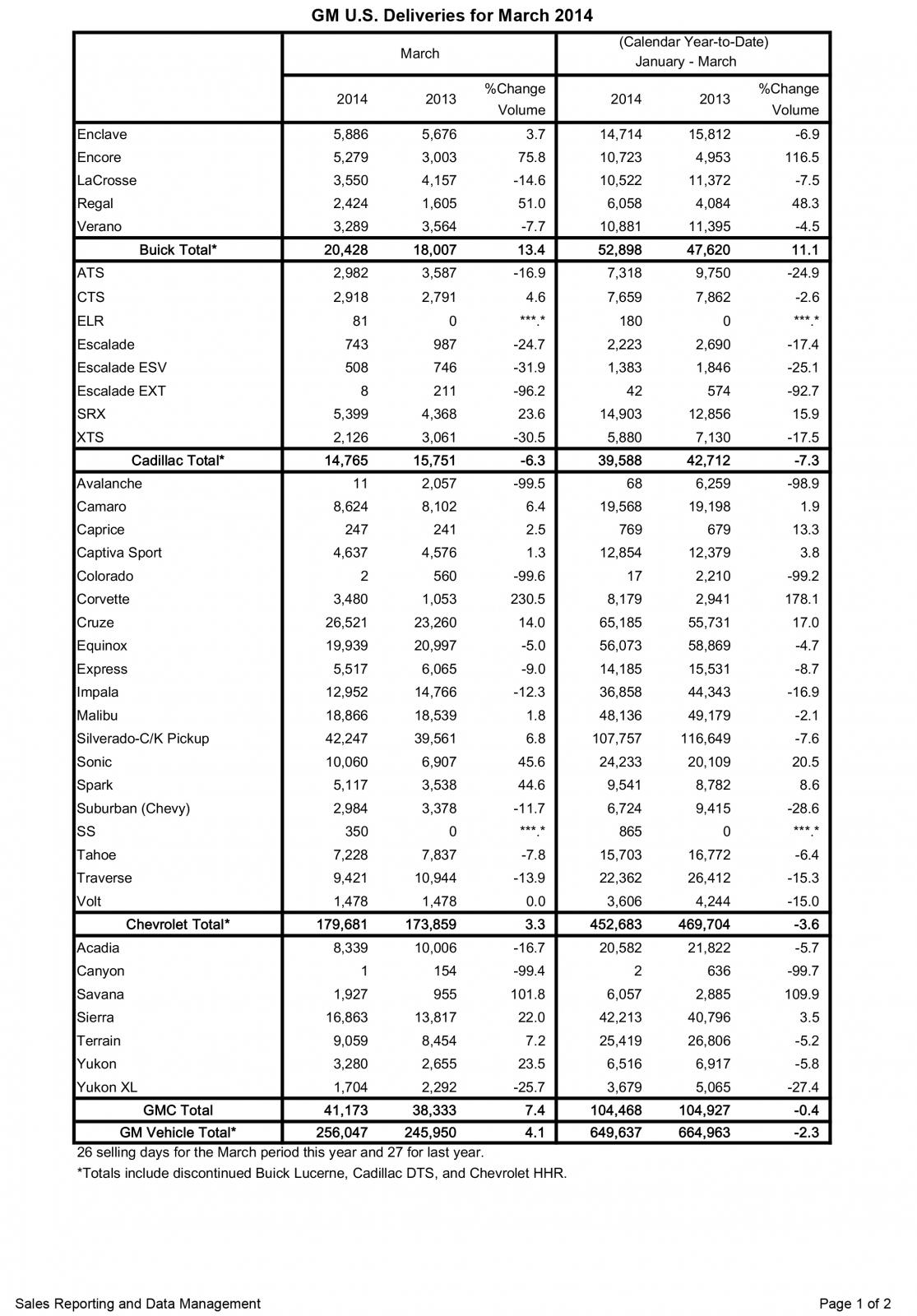 April 3, 201411 yr GM’s Retail Sales up 7 percent, Outpacing Industry Average transaction prices hit record $34,000; incentives down during month 2014-04-01 DETROIT – General Motors Co. (NYSE: GM) dealers delivered 256,047 vehicles in the United States in March 2014. Total sales were up 4 percent compared with a year ago. Retail sales were up 7 percent and GM gained retail market share. Fleet sales were down 5 percent due to a planned reduction in rental deliveries. However, commercial fleet sales were up 5 percent for the fifth consecutive monthly increase. “GM’s retail sales, like the weather and the economy as a whole, have been on an improving trend since early February,” said Kurt McNeil, U.S. vice president of Sales Operations. “We expect to see solid economic growth in the months ahead, with the job market, household income and consumer spending all showing positive signs. It is a strong backdrop for the launch of our all-new heavy-duty pickups, large SUVs and other new products, like the Cadillac ATS coupe coming this summer. “Our dealers continue to work hard to exceed people’s expectations for customer care, whether they are shopping for one of our award-winning new products or coming in to have their vehicle serviced,” he said. March Retail Sales Highlights (vs. 2013) Deliveries of the Chevrolet Silverado, the 2014 North American Truck of the Year, were up 14 percent and the GMC Sierra was up 23 percent. During the month, Vincentric, which uses a proprietary model to measure cost of ownership attributes including depreciation, fuel, insurance, maintenance and repair costs, said the Chevrolet Silverado family has the lowest cost among full-size pickups. Deliveries of Chevrolet passenger cars were up 10 percent. The Spark was up 17 percent; Sonic was up 20 percent; the Volt was up 7 percent; the Impala was up 103 percent; and the Corvette, the 2014 North American Car of the Year, was up 221 percent. Deliveries of the Cadillac SRX were up 37 percent. In addition, the CTS family was up 11 percent on the strength of the new 2014 CTS sedan, which is the 2014 Motor Trend Car of the Year. Sales of the Buick Regal were up 52 percent and the Encore was up 71 percent. Sales of large SUVs were up 62 percent, with availability of the all-new 2015 models building, per plan. GM’s incentives as a percentage of average transaction prices, or ATPs, were 10 percent compared with 10.3 percent for the industry, according to J.D. Power PIN estimates through March 23. That is down from February and year over year. GM’s ATPs set a new record of about $34,000, up about $2,000 per unit from February and more than $3,800 from a year ago, according to J.D. Power PIN estimates. GM delayed this release for several hours due to a computer systems issue that impacted dealer sales reporting. These results reflect sales reported through GM’s primary and backup dealer systems and we believe they accurately reflect March sales, although it is possible that a few hundred March deliveries may be reported in April.