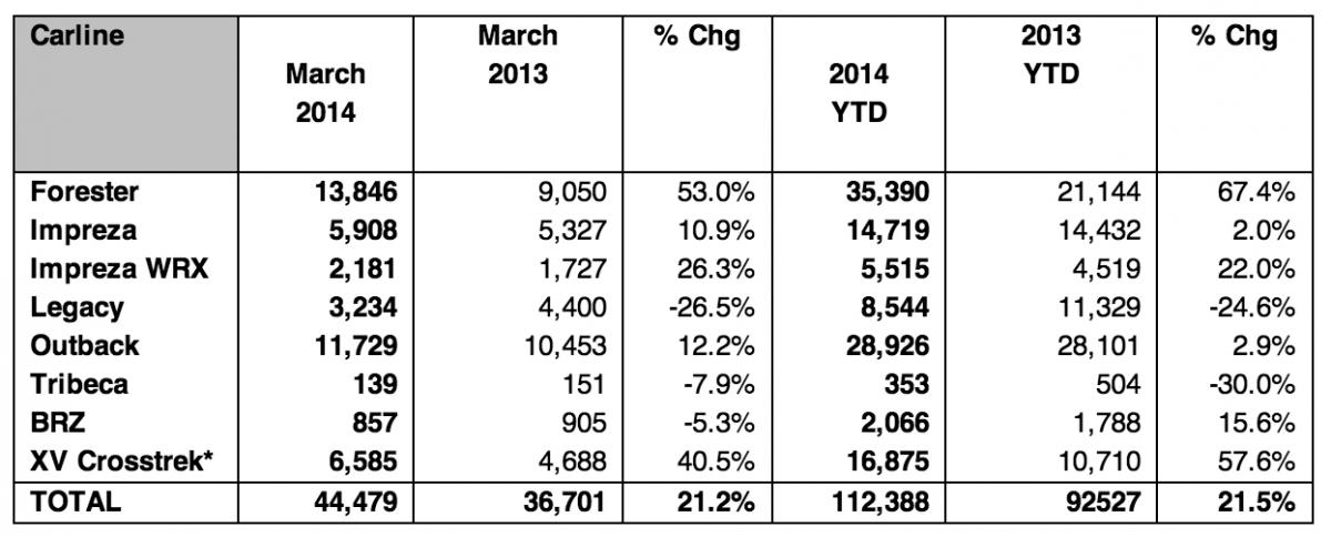 April 3, 201411 yr April 1, 2014 SUBARU OF AMERICA, INC. REPORTS BEST MONTH EVER Best first quarter in company history Best ever month for Forester Best ever month for XV Crosstrek Best month in 10 years for WRX Cherry Hill, N.J. - Continuing its long sales streak, Subaru of America, Inc. has reported record sales of 44,479 vehicles for March 2014. This is an increase of 21% over the March 2013 sales of 36,701 and means the company has now set consecutive monthly sales increases for the past 28 months. The Forester and XV Crosstrek model lines both significantly contributed to the company’s strong March sales and also its performance so far in 2014, which saw the company post first quarter sales of over 100,000 for the first time.Furthering optimism around the brand, an all-new Legacy sedan model was shown this February and more new models are expected from the company later this year.“We are delighted to have once again delivered record results” said Thomas J. Doll, president and chief operating officer, Subaru of America, Inc. “2014 looks already set to be our seventh year of consecutive sales growth, with more new product to come” “We are reporting strong growth and sales across the country” said Bill Cyphers, senior vice president of sales “Our retailers continue to show dedication and commitment to make these record-breaking sales possible”, added Cyphers.