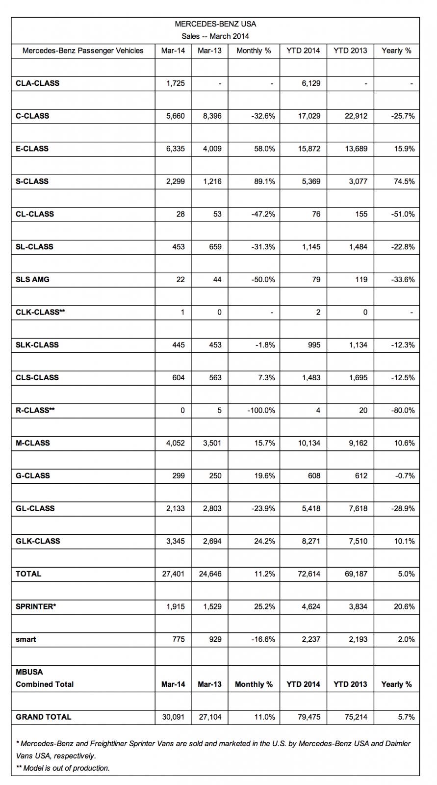 April 3, 201411 yr Mercedes-Benz Posts Best-Ever First Quarter with March Sales of 27,401, Up 11.2% MBUSA up 11% month-to-date with 30,091 units MONTVALE, N.J., April 1, 2014 /PRNewswire/ -- Mercedes-Benz USA (MBUSA) today reported the highest first quarter sales in its history with 30,091 vehicles sold across the Mercedes-Benz, Sprinter and smart model lines in March, up 11% from the 27,104 units sold over the same month last year. The Mercedes-Benz brand alone hit a new benchmark for the month with sales of 27,401, an increase of 11.2%, while year-to-date volumes climbed to 72,614 units, up 5% from March 2013. Adding year-to-date sales of 4,624 for Sprinter Vans and 2,237 units at smart, MBUSA delivered a year-to-date grand total of 79,475. "Thanks to a best-ever March, we've hit a new first quarter sales record in 2014," said Steve Cannon, president and CEO of MBUSA. "Our CLA is making strong headway in the entry luxury arena with sales of more than 20,000 units after just six months on the market. With another knockout series of products waiting in the wings, we expect even higher growth this year and beyond." March sales for the Mercedes-Benz brand were led by the C-, E- and M-Class model lines. The E-Class took the top spot with 6,335 units, increasing 58% from the same month last year, followed by the C-Class at 5,660. The M-Class, perennial best-seller on the SUV side, rounded out the top three at 4,052, up 15.7% from March 2013. At the high end, the flagship S-Class continued to post strong gains with volumes of 2,299 for the month, up 89.1%, while sales of the CLS-Class four-door coupe rose 7.3%. As a whole, retail volumes for Mercedes-Benz passenger cars were up 8.8% in the first quarter of 2014, boosted by sales of the 2014 CLA-Class four-door coupe with 6,129 units year-to-date. The new generation S-Class finished the period up 74.5% compared to the first quarter of 2013. Total first quarter sales for Mercedes-Benz light trucks reached 24,435. The redesigned Sprinter lineup posted sales of 1,915 in March, an increase of 25.2% from the 1,529 units sold in March 2013, while retail volumes for the smart brand totaled 775. Mercedes-Benz AMG high-performance models finished the month up 59.9% at 1,009 with year-to-date volumes increasing 74.4% to 2,830. The company's BlueTEC diesel models recorded March sales of 1,535 and 3,923 year-to-date, on par with the 3,945 diesel units sold through March 2013.