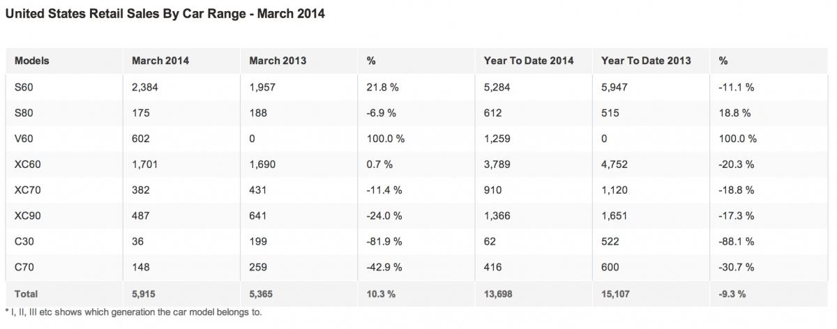 April 3, 201411 yr Volvo Announces March Sales U.S. Sales Up 10.3 Percent ROCKLEIGH, N.J. (April 1, 2014) - Volvo Cars of North America, LLC, (VCNA) reported U.S. sales of 5,915 units for the month, a 10.3 percent increase versus March 2013. The top seller for March was the S60 sports sedan with 2,384 units sold, posting a 21.8 percent increase versus March 2013, followed by the XC60 with 1,701 units sold. New this year and rounding out the 60 cluster, the V60 sportswagon is in dealerships now and combines the driving dynamics of a luxury sports sedan with the space and utility to support an active lifestyle. Thanks to Volvo’s new Drive-E engine family, the V60 features best-in-class fuel economy, with the T5 Drive-E FWD achieving 37 highway / 25 city / 29 combined mpg. The V60 is also offered with two of Volvo’s existing engines, the V60 T5 AWD and the V60 T6 R-Design AWD.
