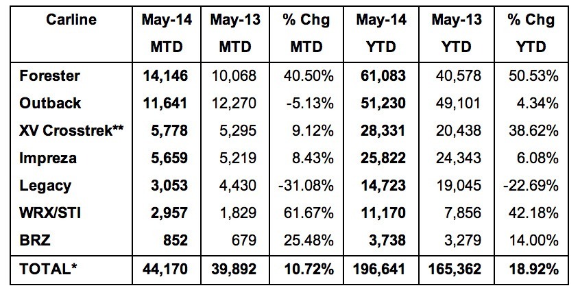 June 3, 201411 yr Subaru Reports Best-Ever May Sales 30 consecutive months with year-over-year growth Best month ever for Forester, WRX/STI Best May ever for Outback Third consecutive month that Subaru brand sales exceed 40,000 sales Forester now marks ten consecutive months of more than 10,000 sales CHERRY HILL, N.J., June 3, 2014 /PRNewswire/ -- Subaru of America, Inc. today reported 44,170 vehicle sales for May 2014, a 11 percent increase over May 2013 sales of 39,892 and the best-ever May sales month in company history. Year-to-date sales for Subaru total 196,641 - a 19 percent increase over the same period in 2013. The company has now seen 30 consecutive months of year-over-year growth and is already on its way to its sixth successive annual sales record. Year-to-date, the Forester model increased sales 51 percent over the same period in 2013. Sales of the small crossover, XV Crosstrek were also notably strong with 28,331 vehicles reported sold year-to-date. "With very positive press reaction to the all-new Legacy and Outback models we expect even stronger demand as we enter the summer months, and we remain on track for another record year." said Thomas J. Doll, president and chief operating officer, Subaru of America, Inc. "We are having another great year," said H. William Cyphers, senior vice president of sales. "Every model line is in demand, and our challenge is to keep supply levels high enough to keep the customers coming in our showrooms satisfied."