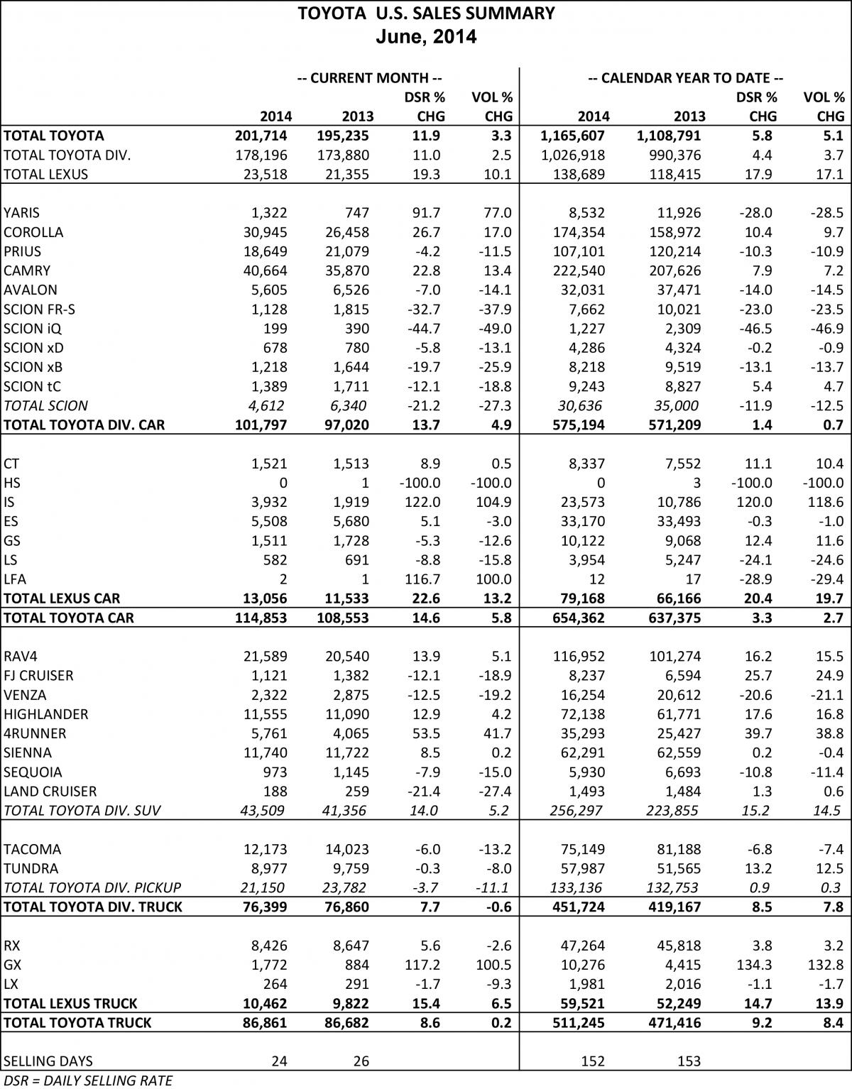 July 1, 201411 yr Toyota Division is No. 1 Retail Brand In First Half of 2014 Camry and Corolla lead their segments in first six months of 2014; Lexus up over 10 percent in June TORRANCE, Calif. (July 1, 2014) – Toyota, Scion and Lexus today reported total June 2014 sales results of 201,714 units, an increase of 11.9 percent from June 2013 on a daily selling rate (DSR). On a raw-volume basis, unadjusted for 24 selling days in June 2014 versus 26 selling days in June 2013, sales increased 3.3 percent from year-ago month. For the first half of the year, Toyota, Scion and Lexus reported sales of 1,165,607 units. With 152 selling days in the first half of 2014 versus 153 selling days during the same period in 2013, sales are up 5.8 percent on a DSR basis. Unadjusted, sales were up 5.1 percent year-over-year. Toyota division posted June 2014 sales of 178,196 units, up 11 percent year-over-year on a DSR basis. Volume-wise, Toyota division sales increased 2.5 percent over June 2013. Calendar-year-to-date, Toyota division posted sales of 1,026,918 units, up 4.4 percent on a DSR basis and 3.7 percent volume-wise over the same period in 2013. “Sales in the first half of 2014 indicate a steadily recovering industry, and we expect this pace to increase as we move into the second part of the year,” said Bill Fay, Toyota division group vice president and general manager. "In June, Camry and Corolla posted double-digit gains as passenger cars showed renewed strength industry-wide.” Lexus reported June sales of 23,518 units, a 19.3 percent increase on a DSR basis and a 10.1 percent increase on a raw-volume basis, both year-over-year. Calendar-year-to-date, Lexus division posted sales of 138,689 units, up 17.9 percent on a DSR basis and 17.1 percent volume-wise over the same period in 2013. “While the industry has been posting healthy gains, Lexus has been able to more than double the average growth rate with a combination of fresh new products, improving availability and industry-leading customer satisfaction practices,” said Jeff Bracken, Lexus group vice president and general manager. “The new Lexus IS and GX models were two of the industry's strongest performing products during the first six months of 2014.” Other Highlights: Camry up over 13 percent in June; up over 7 percent in first half All-new Corolla up 17 percent with sales of nearly 31,000 units in June Toyota and Lexus hybrids post sales of almost 28,000 units in June Prius posts sales of 18,649 units in June Toyota division trucks flat in June; up 7.8 percent in first half All-new RAV4 increased 5.1 percent in June; up almost 16 percent in first half All-new Highlander up 4.2 percent in June; up nearly 17 percent in first half 4Runner up 41.7 percent in June; up about 39 percent in first half All-new Tundra posts sales of almost 9,000 units in June; up 12.5 percent in first half Tacoma posts sales of more than12,000 units in June All-new Lexus IS increased 105 percent in June; up over 118 percent in first half Lexus ES posts sales of more than 5,500 units in June Lexus luxury utility vehicles up 6.5 percent in June; up 14 percent in first half Lexus RX posts sales of 8,426 units in June; up over 3 percent in first half Lexus GX posts triple-digit gains for the eighth month in a row; up over 130 percent in first half