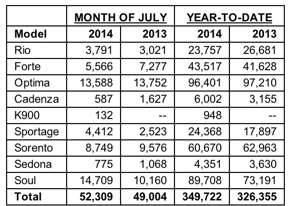 August 1, 201411 yr Kia Motors America Announces Record July Sales Year-to-Date Sales Up 7.2 Percent Over 2013 IRVINE, Calif., Aug. 1, 2014 /PRNewswire/ -- Coming off the best first half sales performance in company history, Kia Motors America (KMA) today announced record July sales of 52,309 units, a 6.7 percent increase over the same period last year. After launching seven all-new or significantly redesigned vehicles in 2013, Kia's year-to-date sales are up 7.2 percent, and the brand's aggressive new product cadence will continue this quarter with the scheduled launches of the all-new Sedona and Soul EV. Since arriving in 2009, U.S. sales of the iconic Soul have exceeded the 500,000 unit mark, and the wildly popular urban passenger vehicle recently topped the Compact MPV segment in the J.D. Power APEAL Study for the third straight year. "Kia's 20th anniversary in the U.S. has included a number of historic milestones and achievements resulting from one of the freshest and most wide-ranging lineups in the industry as well as our unyielding commitment to delivering world-class quality," said Michael Sprague, executive vice president of sales and marketing, KMA. "As Kia's units-in-operation count continues to grow, so does the level of recognition from highly regarded industry experts and consumers who have experienced the extraordinary design, technology, safety and value we offer, from subcompact to luxury."