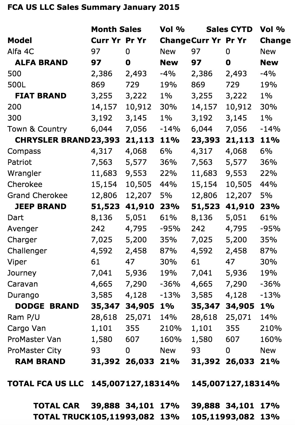 February 3, 201511 yr FCA US LLC Reports January 2015 U.S. Sales Increased 14 Percent; Best January Sales Since 2007 58th-consecutive month of year-over-year sales gains Chrysler, Jeep®, Dodge, Ram Truck and FIAT brands each post sales gains in January compared with same month a year ago Jeep brand records best ever January sales; Jeep Cherokee sales up 44 percent Dodge Challenger sales up 87 percent; best January sales ever Chrysler 200 turns in best January sales ever 10 FCA US vehicles set sales records in January February 3, 2015 , Auburn Hills, Mich. - FCA US LLC today reported U.S. sales of 145,007 units, a 14 percent increase compared with sales in January 2014 (127,183 units), and the group’s best January sales since 2007. The Chrysler, Jeep®, Dodge, Ram Truck and FIAT brands each posted year-over-year sales gains in January compared with the same month a year ago. The Jeep brand’s 23 percent increase was the largest sales gain of any FCA US brand and its best January sales ever. The group extended its streak of year-over-year sales gains to 58-consecutive months. “We kicked off 2015 with a 14 percent increase in sales and extended our year-over-year sales streak to 58-consecutive months,” said Reid Bigland, Head of U.S. Sales. “In spite of some tough 2015 comparisons, we remain confident in our ability to post year-over-year sales increases on the back of strong retail demand for our products.” Ten FCA US vehicles set records in the month of January, including four of the five Jeep brand vehicles. The Jeep Cherokee, Jeep Wrangler, Jeep Patriot, and Jeep Compass each recorded their best ever sales in the month of January. Likewise, the Chrysler 200, Dodge Dart, Dodge Challenger, Ram ProMaster, Ram Cargo Van and Fiat 500L each logged their best ever January sales. FCA US finished the month of January with a 101-day supply of inventory (563,575 units). U.S. industry sales figures for January are internally projected at an estimated 17.0 million units Seasonally Adjusted Annual Rate (SAAR). Jeep Brand Jeep brand sales were up 23 percent, the brand’s best sales performance ever in the month of January and its 16th-consecutive month of year-over-year sales gains. The Jeep brand has set a sales record in each month dating back to November 2013. The Jeep Cherokee, Wrangler, Patriot and Compass each logged their best ever sales in the month of January. Sales of the Cherokee were up 44 percent, the largest percentage year-over-year sales gain of any Jeep brand model in January. The Cherokee Trailhawk – the most capable mid-size sport utility vehicle – was named “Four Wheeler of the Year” by Four Wheeler magazine in January, while the Jeep Grand Cherokee EcoDiesel was named “2015 Green SUV of the Year” by the Green Car Journal. The Grand Cherokee had its best January sales since 2004. Ram Truck Brand Sales of the Ram pickup truck were up 14 percent in January; its 57th-consecutive month of year-over-year sales gains. It was the pickup truck’s best January sales since 1999. Ram Light Duty pickup sales increased 17 percent in January while Ram Heavy Duty pickups were up 1 percent. Ram Truck brand sales, which include the Ram ProMaster, Ram ProMaster City, and Ram Cargo Van, were up 21 percent, the brand’s best January sales since 2004. The ProMaster and the Cargo Van each recorded their best ever sales in the month of January. Sales of the ProMaster City, the newest addition to the Ram Truck brand product lineup, began in Ram Truck dealerships in January. The Ram Truck brand unveiled the new 2015 Ram 1500 Rebel at the 2015 North American International Auto Show in January. The Rebel brings a one-of-a-kind off-road design to the full-size truck segment. The brand also announced that it will add a new, more fuel-efficient model to its half-ton truck lineup – the 2015 Ram 1500 EcoDiesel HFE – which will deliver the highest fuel economy among all full-size truck competitors. Chrysler Brand Chrysler brand sales increased 11 percent, the brand’s best January sales since 2008. The year-over-year increase was driven by the all-new 2015 Chrysler 200 sedan. Sales of the 200 were up 30 percent, the mid-size sedan’s best ever sales in the month of January and its seventh-consecutive month of year-over-year sales gains. Sales of the new 2015 Chrysler 300 sedan began in January as the first shipments from the Brampton (Ontario) Assembly Plant in Canada began reaching U.S. dealerships. The new 300 sedan’s iconic and unmistakable exterior proportions are now crafted with even more sculptural and expressive style for 2015, with a bolder “face of Chrysler” front grille, signature LED lighting, unique finishes and new wheel designs. Sales of the 300 were up 1 percent in January, its best January sales in two years. Dodge Brand Dodge brand sales were up 1 percent in January, compared with the same month a year ago. Two Dodge brand vehicles set sales records to start the year. Sales of the Challenger were up 87 percent, the muscle car’s best ever sales in the month of January and the largest percentage sales gain of any Dodge brand model in the month. Likewise, the Dart logged its best ever January sales with a 61 percent year-over-year sales gain. The Dodge Charger recorded its best January sales since 2008 with its 35 percent increase. The new 2015 Charger received a Best Resale Value Award in the Full-Size Car category in January from Kelley Blue Book. FIAT Brand FIAT brand sales, which include the Fiat 500 and 500L, were up 1 percent in January, the brand’s best ever sales in the month of January. Sales of the Fiat 500L were up 19 percent in January compared with the same month a year ago. It was the 500L’s best January sales since the model was launched in the U.S. in June 2013. The FIAT brand is coming off of a record year in 2014. The FIAT brand’s full-year sales were up 7 percent in 2014, compared with sales in 2013. It was the FIAT brand’s best ann