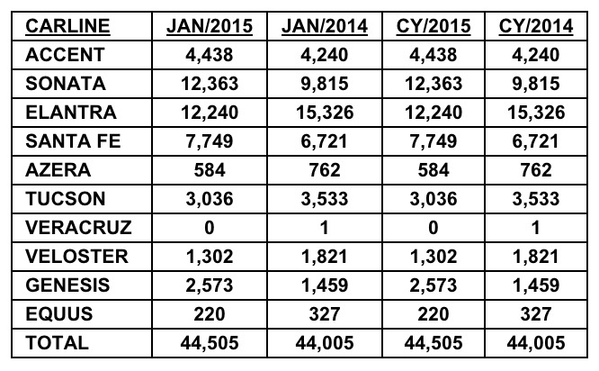 February 3, 201511 yr Hyundai Motor America Reports Best Ever January Sales Best January for Genesis - up 76 percent FOUNTAIN VALLEY, Calif., Feb. 3, 2015 /PRNewswire/ -- Hyundai Motor America today reported its best January in company history, selling 44,505 units for the month, up one percent versus the same period last year. This is the seventh consecutive year of increased sales during the month of January. "With consumer confidence at a seven year high and gasoline and energy prices on the decline, more car buyers will be heading into the dealerships in 2015," said Bob Pradzinski, vice president, national sales. "Consumers are doing their homework - making sound, educated purchasing decisions – and looking for vehicles that equate to 'more for less'. The search for value was one of the key drivers of Hyundai's record setting January sales success as high-performing, quality vehicles such as Genesis, Sonata and Santa Fe continue to offer consumers unprecedented values." The all-new award-winning Genesis sedan, now available with Hyundai's HTRAC AWD system, saw sales gains in the mid-west and eastern part of the country in January, as the snow piled up. Genesis sedan sales were up 76 percent for the month, resulting in Genesis' best January. Sonata, our mid-size sedan was up 26 percent and Santa Fe, Hyundai's CUV, was up 15 percent.