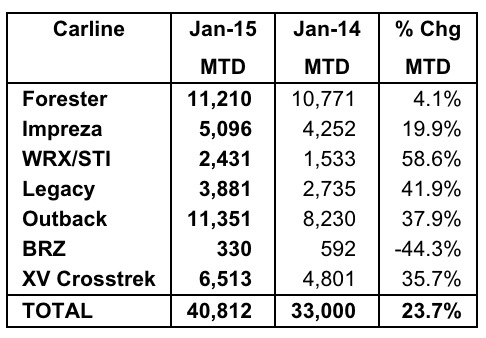 February 3, 201511 yr Subaru of America, Inc. Reports Record January Sales Record January - monthly sales increase 24 percent over January 2014 38th consecutive month of month-over-month growth Best January ever for Forester, WRX/STI, Legacy-sedan, Outback, XV Crosstrek 11th consecutive months of more than 10,000 Outbacks sold 18th consecutive months of more than 10,000 Foresters sold Seven millionth vehicle sold in the U.S. CHERRY HILL, N.J., Feb. 3, 2015 /PRNewswire/ -- Subaru of America, Inc. today reported 40,812 vehicle sales for January 2015, a 24 percent increase over January 2014. These results continue the company's sales momentum from 2014 where Subaru achieved six consecutive years of record sales and exceeded 500,000 annual sales – a first in company history. January marked the 11th consecutive month of 40,000+ vehicle sales for the company. Forester, WRX/STI, Legacy, Outback, and XV Crosstrek sales were notably strong as each model line achieved its best January ever. WRX/STI and Legacy sales for January 2015 increased 59 and 41 percent respectively over January 2014. The XV Crosstrek small CUV also added 6,513 sales to the month's total. All seven 2015 Subaru models recently earned safety awards from the Insurance Institute for Highway Safety (IIHS) – two with Top Safety Pick and five with Top Safety Pick+ including the Forester, Legacy, Outback, Impreza, and XV Crosstrek, when equipped with optional EyeSight® Driver Assist Technology. In January, Subaru also earned Kelley Blue Book's prestigious 2015 Best Resale Value Brand Award and three vehicle segment awards – Compact Car Category: 2015 Subaru Impreza; Sporty Compact Car Category: 2015 Subaru WRX; and Mid-Size Car Category: 2015 Subaru Legacy. "We are off to a strong start to 2015 by having the best January sales in our franchise's history and we expect strong demand to continue throughout the year," said Thomas J. Doll, president and chief operating officer, Subaru of America, Inc. "We are excited to see strong sales across our entire model line, as well as achieve the sale of our seven millionth vehicle." Jeff Walters, senior vice president of sales said; "Subaru continues to receive outstanding accolades from the Insurance Institute for Highway Safety and the automotive press for our products. These favorable reviews are increasing the positive image and awareness of our products among the American buying public and help drive the demand we are seeing in our retail stores."