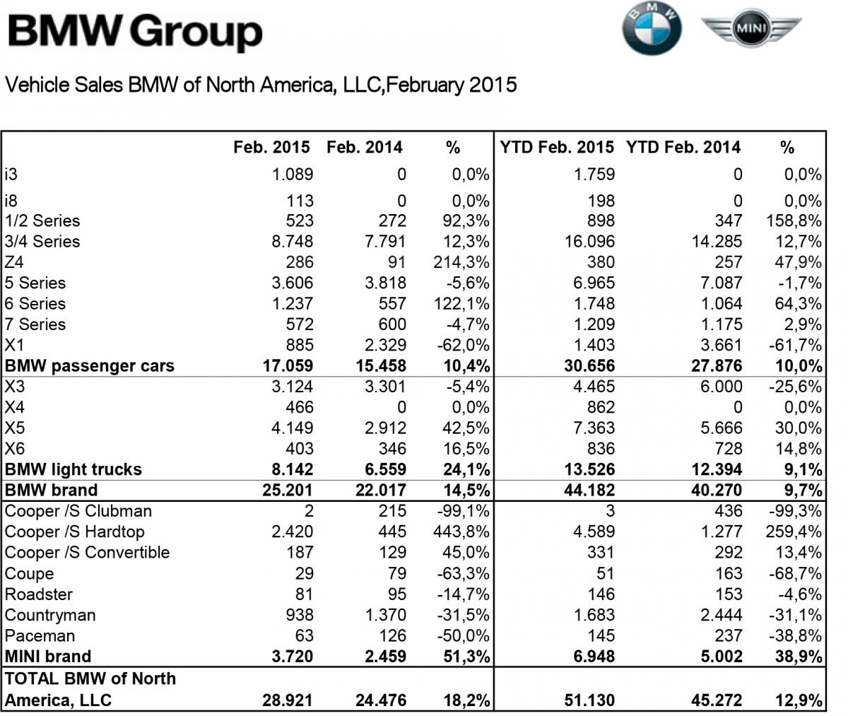March 3, 201511 yr BMW Group U.S. Reports February 2015 Sales BMW brand up 14.5 percent, sets February sales record MINI brand sales up 51.3 percent Woodcliff Lake, NJ – March 3, 2015… Sales of BMW brand vehicles increased 14.5 percent in February for a total of 25,201 compared to 22,017 vehicles sold in February, 2014. “In spite of ferocious cold and mountains of snow in so much of the country in February, our customers proved they could overcome and made it possible for BMW to post a new record for February sales,” said Ludwig Willisch, President and CEO, BMW of North America. “Improved availability of the always popular X5 and the strong and growing interest in our 2 and 4 Series cars are good indicators of what’s ahead.” In February, notable vehicles sales included the BMW i3 with sales of 1,089 vehicles, the BMW X5 increased 42.5 percent to 4,149 vehicles and BMW 6 series which increased 122.1 percent to 1,237 vehicles. BMW Group Sales The BMW Group in the U.S. (BMW and MINI combined) reported February sales of 28,921 vehicles, an increase of 18.2 percent from the 24,476 vehicles sold in the same month a year ago. MINI Brand Sales For February, MINI USA reports 3,720 automobiles sold, an increase of 51.3 percent from the 2,459 sold in the same month a year ago.