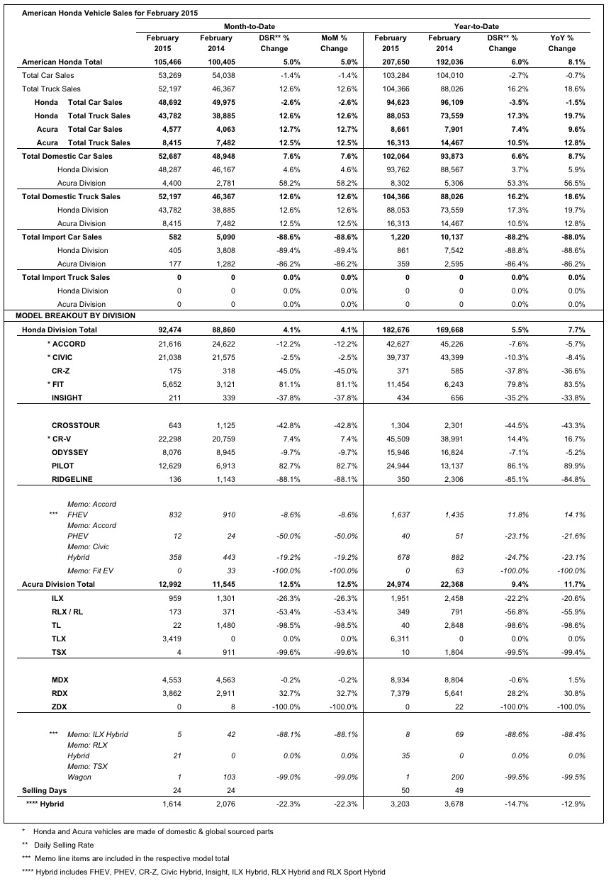 March 3, 201511 yr Diverse Lineup of Light Trucks and Sub-Compacts Leads American Honda February 2015 Sales Increase Acura trucks set new February benchmark, with a 12.5 percent gain on sales of 8,415 Honda Fit sets new February record, rising 81 percent on sales of 5,652 units Honda Pilot has February to remember, with sales up 82.7 percent TORRANCE, Calif., March 3, 2015 /PRNewswire/ -- American Honda Motor Co., Inc. today reported February Honda and Acura vehicle sales of 105,466 units, an increase of 5.0 percent versus February 2014. Sales of Acura light trucks set a new February record, rising 12.5 percent on sales of 8,415 vehicles. The Honda Division sold 92,474 vehicles in February—an increase of 4.1 percent for the month. The Acura brand posted sales of 12,992 units in February, rising 12.5 percent over the same period last year. Honda Honda's remarkable Fit subcompact set another monthly record in February, posting an 81 percent increase over year ago totals. The Pilot again showed considerable sales strength, creating strong momentum as the company prepares for the arrival of the all-new 2016 Pilot this summer. Sales of the best-selling CR-V also rose in February, gaining 7.4 percent vs. the same period last year. Pilot and CR-V pushed Honda light trucks to a total increase of 12.6 percent for the month. Honda Fit easily smashed its previous February record, rising 81 percent on sales of 5,652. Sales of the best-selling Honda CR-V totaled 22,298 units, up 7.4 percent for the month. The Honda Pilot posted one of its best months in the last year with sales up 82.7 percent on sales of 12,629 vehicles. Overall Honda truck sales totaled 43,782 for a gain of 12.6 percent in February. "Strong February sales of both the sub-compact Fit and our 8-passenger Pilot SUV demonstrate the power of the Honda brand with individual buyers," said Jeff Conrad, Honda division senior vice president and general manager. "Honda is delivering incredible value throughout our product lineup that is resonating with our customers." Acura Acura trucks continue to light up the sales charts with RDX setting a new February best just ahead of the launch of the refreshed 2016 model. MDX also sold at near record levels during a transition month as the 2016 model became available at Acura dealers in early February. Combined, the RDX and MDX gave Acura trucks a new February sales record. TLX sales remain strong, taking important share in the super-competitive mid-luxury sedan segment and spurring overall Acura car sales to 4,577 in February, an increase of 12.7 percent. And the significantly revised 2016 ILX went on sale mid-month, adding new power to a strengthening Acura sedan lineup. RDX captured yet another monthly sales record with 3,862 units sold in February, up 32.7 percent for the month. MDX maintained a strong pace as America's 3-row luxury SUV sales leader easily surpassed 4,500 units again. RDX and MDX combined for a February record of 8,415 Acura trucks sold in February, an increase of 12.5 percent for the month. "While bone-chilling winter weather takes its toll on much of the country, Acura sales continue to reflect a strong warming trend," said Mike Accavitti, Acura division senior vice president and general manager. "Our MDX and RDX luxury SUVs remain red hot—with refreshed 2016 models only adding fuel to the fire. And the substantially upgraded 2016 ILX sport sedan now in showrooms nationwide will burn brighter than ever."