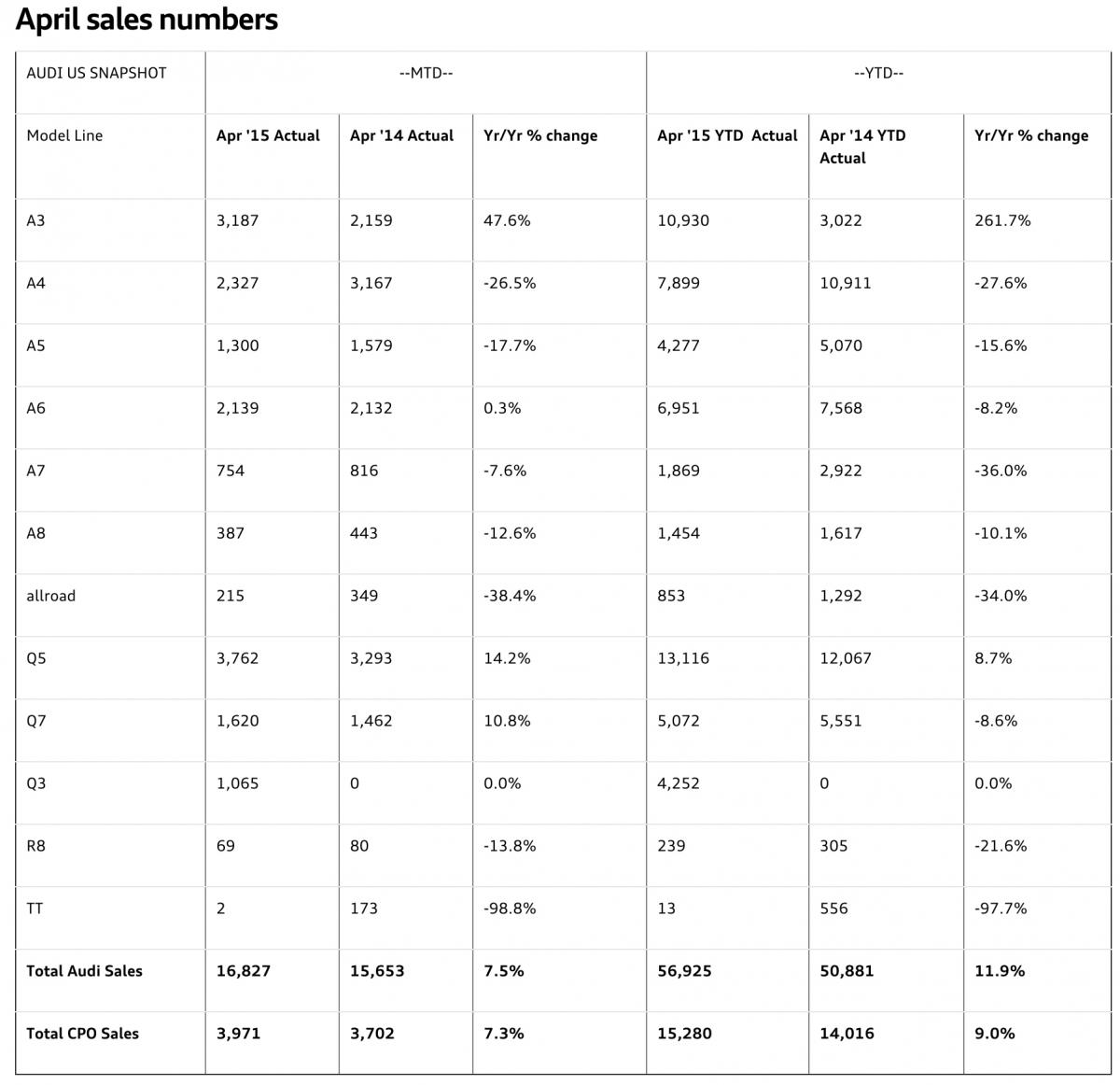 May 4, 201510 yr Audi sets 52nd consecutive monthly U.S. sales record in April 2015 May 01, 2015 | HERNDON, Virginia Sales for the month rose 7.5% to 16,827 vehicles A3 models achieved best-ever monthly sales since launch Demand for SUV models was strong for the month Audi reported that its April 2015 sales increased 7.5% to 16,827 vehicles, a total that stands as the brand’s 52nd straight month of record U.S. sales. Audi achieved its best-ever April sales in the brand’s U.S. history. The previous April record was set in 2014 with sales of 15,653 vehicles. Through the first four months of 2015, Audi U.S. sales rose 11.9% from last year to 56,925 vehicles. “This spring, our dealers continued to show robust sales performance across the Audi product portfolio,” said Mark Del Rosso, Executive Vice President and Chief Operating Officer, Audi of America. “Strong demand in particular for models such as the Audi Q3 and the A3 gives us confidence that we will continue to draw new customers to our brand well into the summer.” April represented strong demand for Audi luxury SUVs, with a 35.6% increase in sales encompassing the Audi Q3, Q5 and Q7 models. The Q5 posted a 14.2% increase from last year, and the Q7 posted a 10.8% increase from last April. The A3 model line achieved record sales in April with a 47.6% increase over last year. The most recent month was the best-ever sales month for both the A3 Sedan and the A3 Cabriolet models since their U.S. sales debut in 2014. Audi Certified pre-owned vehicle sales also set a new record for April, with a 7.3% gain on 3,971 CPO vehicles sold. CPO sales year-to-date increased 9.0%. Audi holds the longest running monthly record sales streak in the premium car market according to a competitive sales report from MotorIntelligence.com.