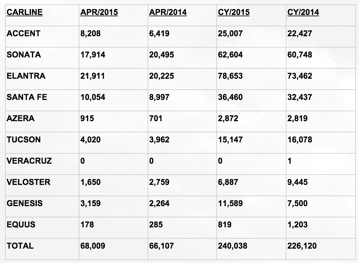 May 4, 201510 yr Hyundai Motor America Reports Record April Sales Four models have their best-ever April sales FOUNTAIN VALLEY, Calif., May 1, 2015 /PRNewswire/ -- Hyundai Motor America today reported its best April ever, selling 68,009 units, a three percent increase compared with sales in April 2014 and up, year-to-date, six percent. "For six years in a row we've set April sales records going into the spring selling season. With the launch of our all-new Sonata Hybrid and first Sonata Plug-In Hybrid this month, we are well poised to keep this momentum going," said Bob Pradzinski, vice-president National Sales, Hyundai Motor America. Genesis sedan, led by the popularity of Hyundai's HTRAC all-wheel drive system, once again was at the forefront with a 142 percent increase over last year, followed by the Sonata Hybrid, up 21 percent, Elantra sedan, up 16 percent and the Santa Fe, up 10 percent – all setting their best-ever April sales record. The Azera saw sales gains of 30 percent and the sub-compact Accent was up 28 percent.