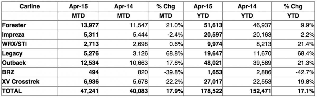 May 4, 201510 yr May 1, 2015 SUBARU OF AMERICA, INC. REPORTS RECORD APRIL SALES Record April - monthly sales increase 18 percent over April 2014 41st consecutive month of year-over-year growth Best April ever for Forester, Legacy, Outback and XV Crosstrek 17 percent increase YTD over 2014 21st consecutive months of more than 10,000 Foresters sold 14th consecutive months of more than 10,000 Outbacks sold Cherry Hill, N.J. - Subaru of America, Inc. today reported record sales for April 2015 totaling 47,241 vehicles, an 18 percent gain over April 2014. The company also reported year-to-date sales of 178,522, a 17 percent gain over the same period in 2014. April marked the 14th consecutive month of 40,000+ vehicle sales for the company. Forester, Legacy, Outback and XV Crosstrek sales were notably strong as each model line achieved its best April ever. Legacy sales for April 2015 increased 68.8 percent over the same month in 2014. In April, Subaru earned two 2015 Kelley Blue Book Brand Image Awards for Most Trusted Brand and Best Performance Brand. The Kelley Blue Book Brand Image Awards recognize automakers’ outstanding achievements in creating and maintaining brand attributes that capture the attention and enthusiasm of the new-vehicle buying public. “Our April results exceeded our expectations and we are delighted to have achieved another monthly sales record,” said Thomas J. Doll, president and chief operating officer, Subaru of America, Inc. “We have an awesome group of retailers who have made these results possible and are the true strength of our brand.” “We have seen record numbers of consumers shopping the Subaru brand and we continue to have excellent demand across our entire line-up, said Jeff Walters, senior vice president of sales, Subaru of America, Inc. “We are pleased by the outstanding results provided by our retailers that included the best April ever for Forester, Legacy, Outback, and XV Crosstrek.”