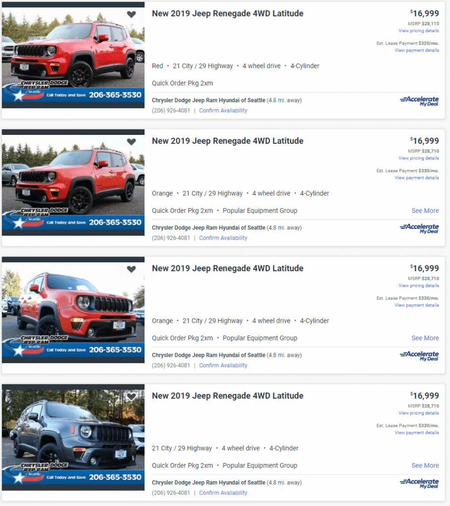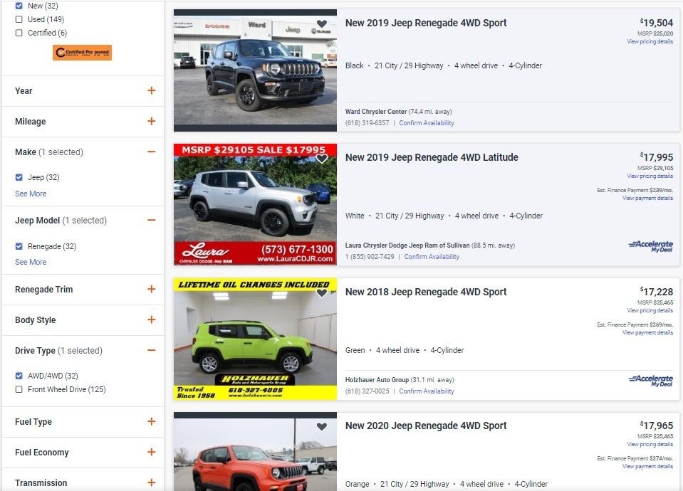 February 12, 20206 yr @daves87rs I think you need to go to another market if you do not find any Jeeps in the mid teens. Here in the Greater Seattle area, I did a search on AutoTrader and found 197 AWD/4WD Jeep Renegade Sport and Latitude models all from $16 to $19k. Here is just the first few in the long list.