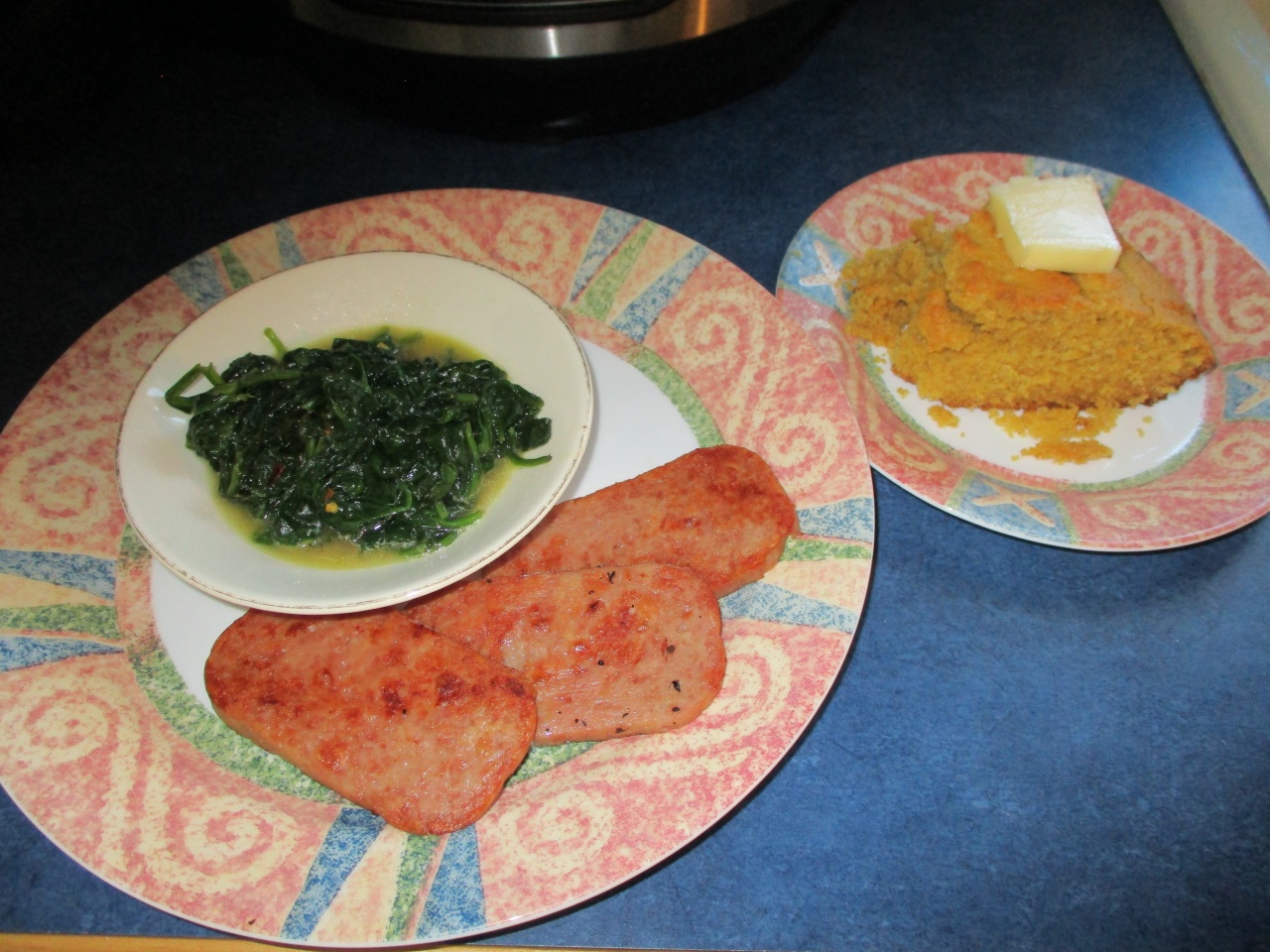 September 6, 20205 yr Southern Style Sunday Dinner: fried Spam, a mess of spinach, and scratch-made (no box!) honey cornbread. Another dinner plate, in reply to numerous requests.